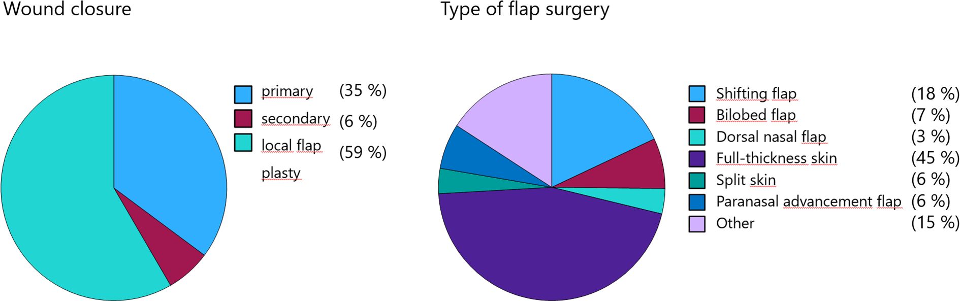 Primary wound closure was performed in 35.2% of cases, and secondary intention healing in 6.4%. The majority of defects (58.4%) were reconstructed using local flap techniques. Among these, full-thickness skin grafts were the most common method (45.3%), followed by advancement flaps (18.0%) and bilobed flaps (7.2%). Additional techniques included paranasal advancement flap (Nelaton) (6.5%), dorsal nasal flap (Rieger) (3.6%), and split-thickness skin grafts (3.6%). Other methods were used in 15.8% of cases (Figure 6). In 40% of cases, wound coverage was performed on the same day as the complete (R0) tumor resection, whereas 60% underwent a two-stage reconstruction. Immediate reconstruction was exclusively performed using advancement flaps and full-thickness skin grafts. No flap revision was required due to an R1 situation in cases treated with single-stage reconstruction.