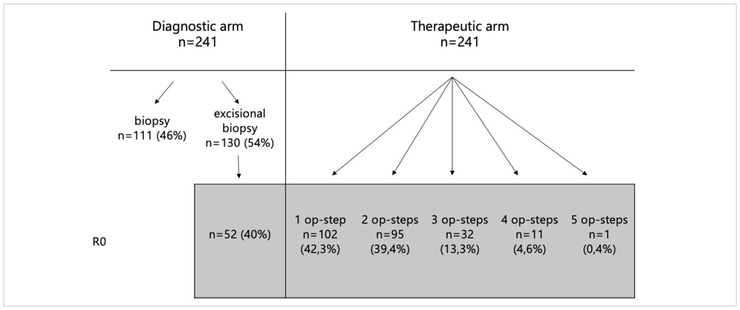 Table 1. Overview of tissue sampling methods and distribution of the number of surgical stages required to achieve tumor clearance in the therapeutic pathway.