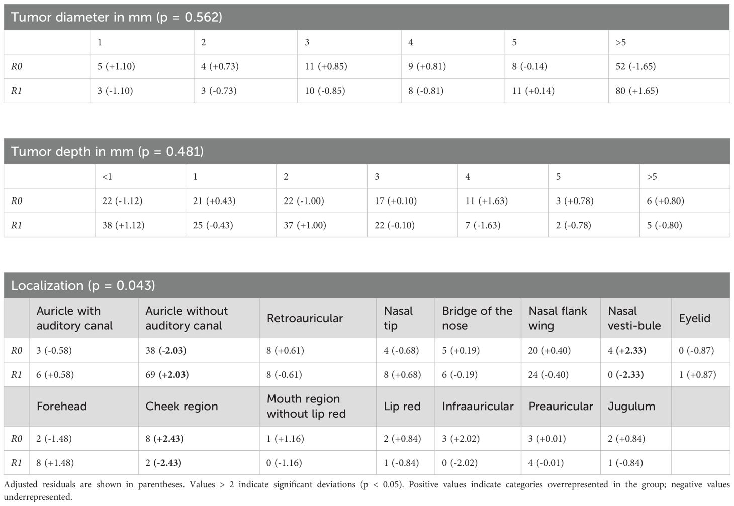 Regarding tumor localization and resection margin status in excisional biopsy cases, adjusted residuals revealed that lesions located in the nasal vestibule and cheek occurred more frequently in R0 resections than expected, whereas tumors of the auricle were more common in R1 cases (p = 0.02). All other localization categories showed no substantial deviations from the expected frequencies.