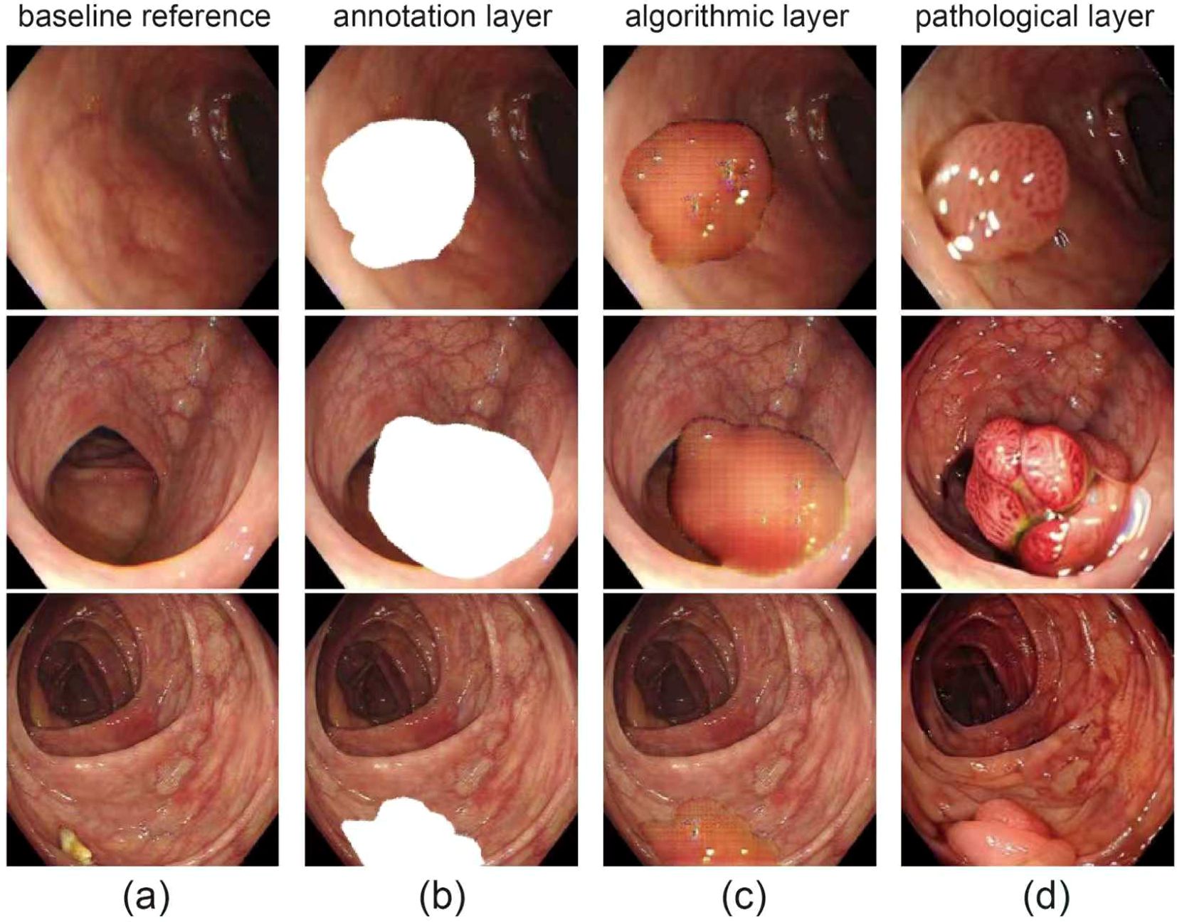 Figure 1. Visual overview of dataset. (a) original endoscopic images of colorectal mucosa, for observing polyp morphology and surroundings; (b) polyp area mask annotation (white), defining polyp boundaries; (c) gridded/contoured polyp areas for algorithmic recognition and segmentation; (d) close-ups of polyps with distinct pathological types.
