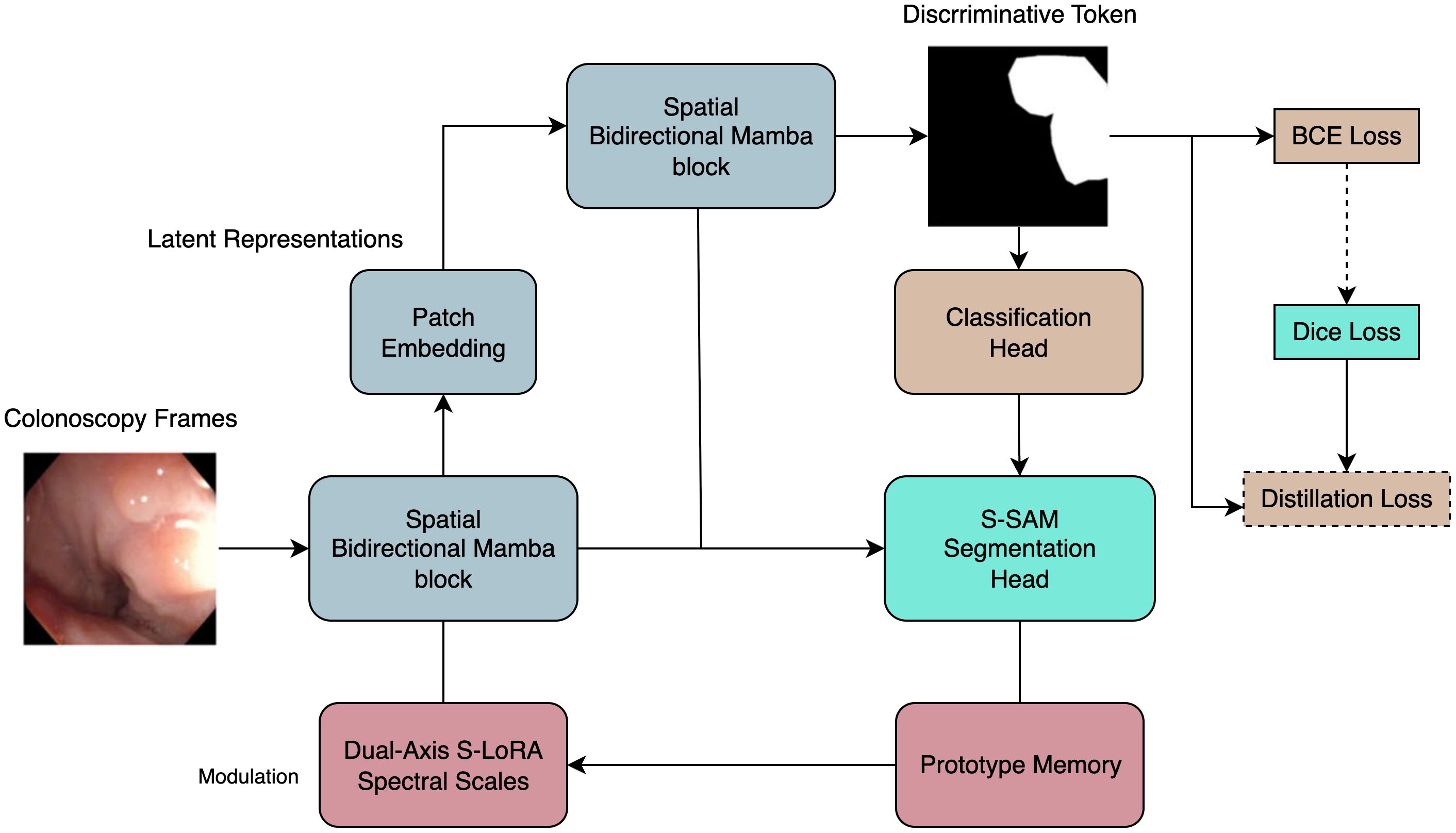 Given a colonoscopy clip with , every frame is first divided into non-overlapping patches, yielding a length- token sequence. Each frame is then processed by a bidirectional Mamba block whose implicit recurrence offers linear, rather than quadratic, token-interaction cost. The resulting spatial representation is forwarded to a causal temporal Mamba, which maintains a hidden state and updates