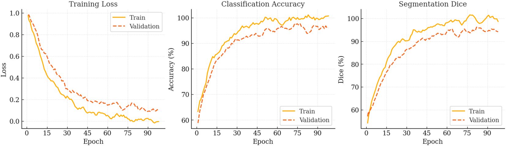 Figure 4. Optimisation trajectory of PESNet over 100 epochs. From left to right: training & validation loss, classification accuracy, and segmentation Dice. All curves are smoothed with a five-epoch moving average.