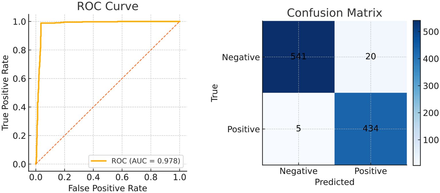 The visualization of key feature maps is shown in Figure 3; the fused map effectively integrates Transformer and CNN features. Clinically, a 2.2 pp F1 gain coupled with a 3.7 pp Dice boost implies that a 30-min screening (50000 frames) would surface six additional flat lesions on average and yield crisper resection margins—without slowing the examination or introducing perceptible latency. The diagnostic classification performance of PESNet on the validation set is shown in Figure 5. The ROC curve achieves an AUC of 0.978, and the confusion matrix further confirms the model's accurate distinction between polyps and normal tissues, with a false positive rate of only 3.5% and a false negative rate of 2.1%, fully demonstrating its diagnostic reliability.