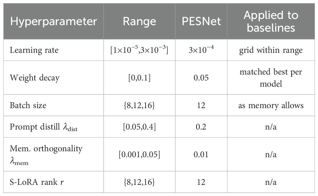 Equation 7 defines the model’s total loss function with and . All modules are trained jointly using AdamW (initial learning rate , cosine decay, weight decay 0.05). Convergence is reached in 35 k iterations on two RTX 6000 Ada GPUs. redHyperparameters were selected by a coarse-to-fine search (Optuna, 50 trials; search ranges in Table 1), then fixed across all datasets and seeds for fair comparison. The final network—including frozen backbone, spectral scale–shift vectors, prompt projector and prototype memory—occupies 820 MB of VRAM yet maintains 46 fps inference on an NVIDIA® Jetson Xavier NX, thereby satisfying real-time clinical constraints while materially improving both diagnostic accuracy and delineation fidelity.