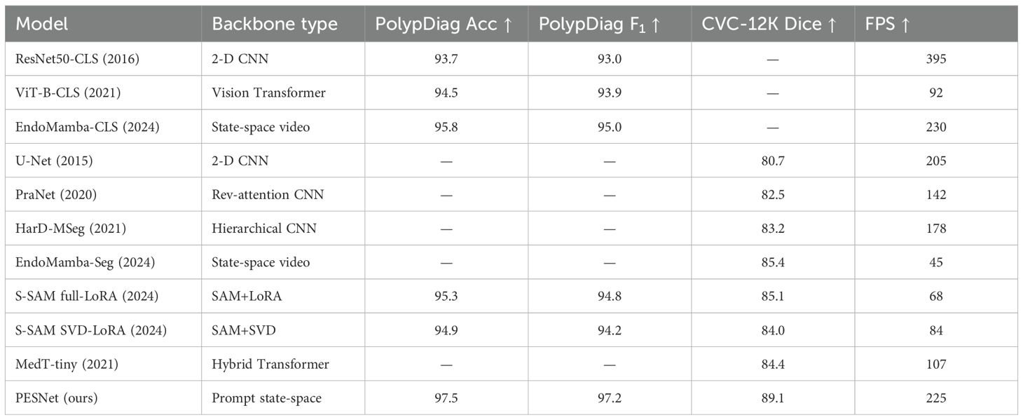 Beyond colonoscopy, prompt-aware or attention-enhanced vision models have advanced diverse medical tasks. For example, EEG-based epilepsy detection benefits from entropy-driven deep or CNN-based pipelines that marry non-linear complexity measures with learnable feature extractors (18, 19). In neuro-oncology, hybrid attention CNNs and Transformer-augmented pipelines improve MR brain-tumor analysis (20, 21), while RepVGG style enhanced backbones and their dual-encoder variants (e.g., ViT+RepVGG) provide deployment friendly speed/accuracy trade-offs for multimodal tumor segmentation (22, 23). These trends motivate lightweight attention and adaptor designs that transfer well to endoscopy. We therefore situate PESNet among recent Transformer-hybrids Jia and Shu (24), self-supervised/pre-training and PEFT practices for SAM-family adaptation (25), and multi-modal fusion approaches (26), emphasizing parameter-efficient prompting/adapters as a practical bridge from foundation models to real-time clinical use.