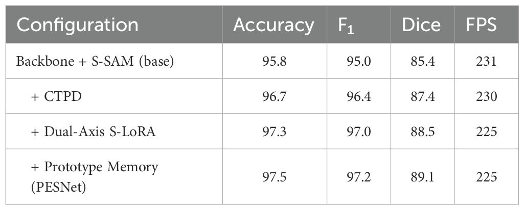 Against EndoMamba-Seg, PESNet yields median Dice improvement of +3.7pp on CVC-12K (Wilcoxon signed-rank Z = 4.11, p<0.001). Across all compared methods, the Friedman test on per-video Dice gives χ2 = 26.8 (df=6), p<10−3; Nemenyi post-hoc shows PESNet significantly better than U-Net, PraNet, HarD-MSeg and MedT-tiny (p<0.05). To quantify the incremental contribution of PESNet’s core components (cross-task prompt distillation (CTPD), Dual-Axis S-LoRA, and prototype memory), we conducted incremental ablation experiments. Starting from a base model (Backbone + S-SAM), we sequentially added each component and measured performance changes, with results summarised in Table 3.