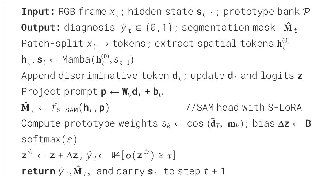 Our framework performs simultaneous frame-level diagnosis and pixel-accurate delineation while remaining within the strict 40 ms latency budget imposed by modern endoscopy workstations. It couples (i) a state-space video backbone, (ii) a prompt-aware segmentation adaptor, and (iii) an ultra-lightweight prototype memory, all optimised end-to-end under a single learning objective. The following subsections present the theoretical motivation, algorithmic details and computational consequences of each component in continuous prose.
