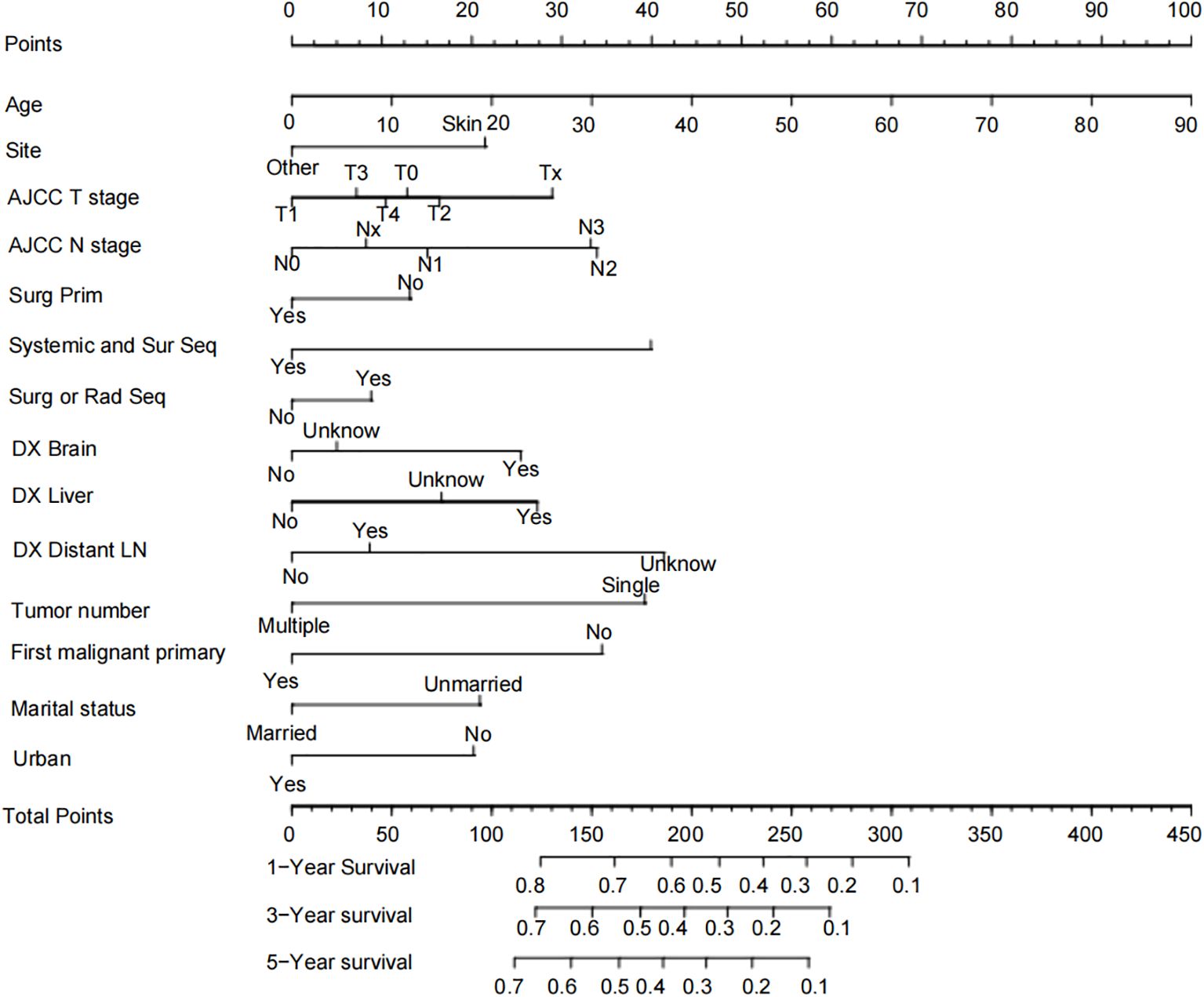 Results: We generated a Nomogram chart incorporating factors such as Age, Site, AJCC T stage, AJCC N stage, Surg Prim, Systemic and Sur Seq, Surg or Rad Seq, DX Brain, DX Liver, DX Distant LN, Tumor number, First malignant primary, Marital status, and Urban. The 1-year, 3-year, and 5-year OS rate AUCs for the training cohort were 0.715, 0.711, and 0.714, respectively, with a c-index of 0.656; the 1-year, 3-year, and 5-year OS rate AUCs for the internal validation cohort were 0.695, 0.725, and 0.719, respectively, with a c-index of 0.650; the 1-year, 3-year, and 5-year OS rate AUCs for the external validation cohort were 0.714, 0.791, and 0.842, respectively, with a c-index of 0.710. Calibration curves showed the consistency between the Nomogram’s observed and predicted prognostic outcomes.
