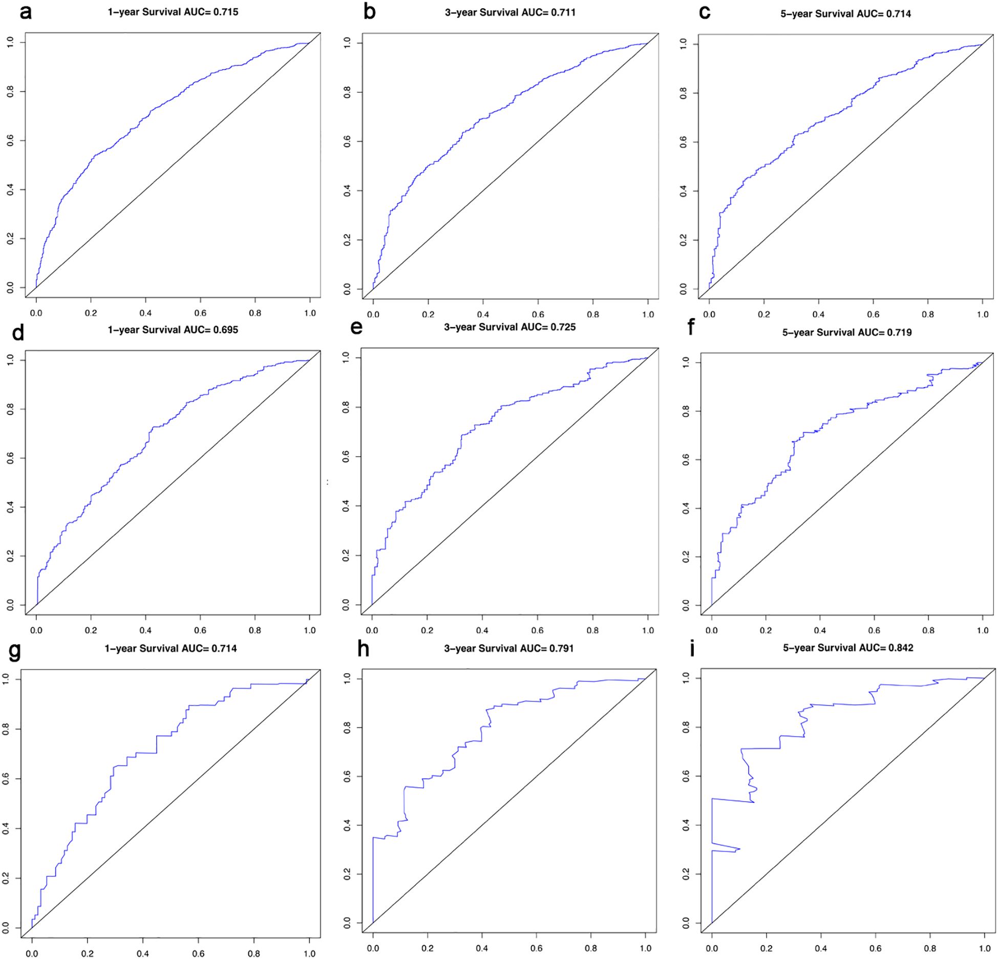 Figure 3. ROC Curves and AUCs for 1-, 3- and 5-year survival in the training cohort (a-c), in the internal validation cohort (d-f) and in the external validation cohort (g-i).