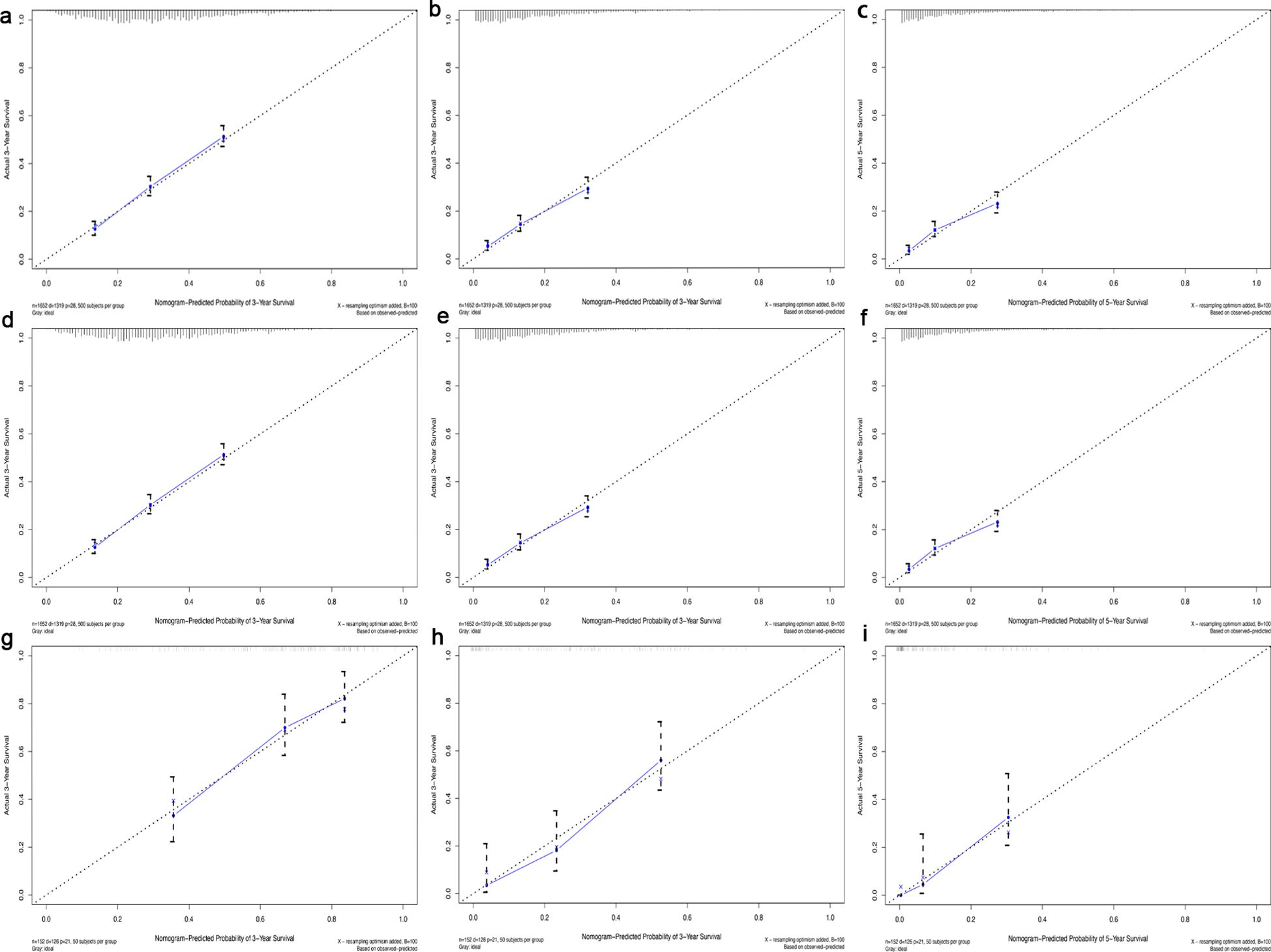 Figure 4. Calibration curve for 1-, 3- and 5-year survival in the training cohort (a-c), in the internal validation cohort (d-f) and in the external validation cohort (g-i). The dotted line represented predicted overall survival, and the blue line represented actual overall survival in the cohort.