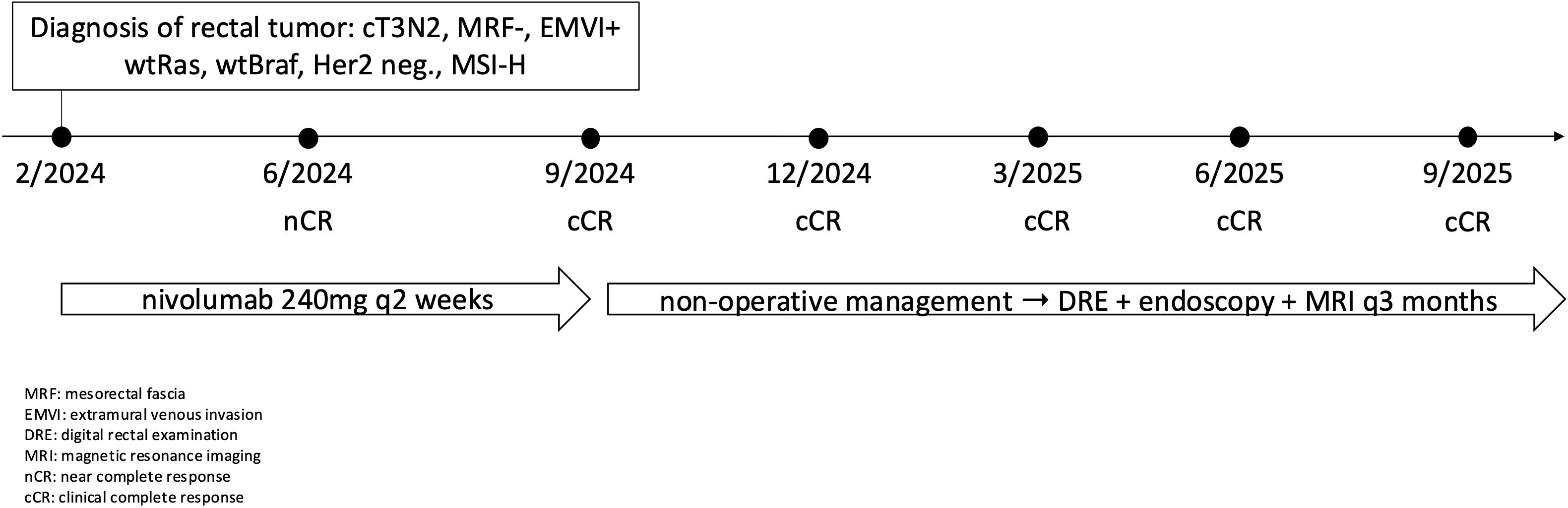 Currently, the patient is 12 months after the last application of nivolumab and is being monitored as part of non-surgical management at 3month intervals using MRI, endoscopy, and DRE. The most recent re-staging took place in September 2025, with cCR persisting (Figure 1c). Figure 2 shows timeline of patient treatment.