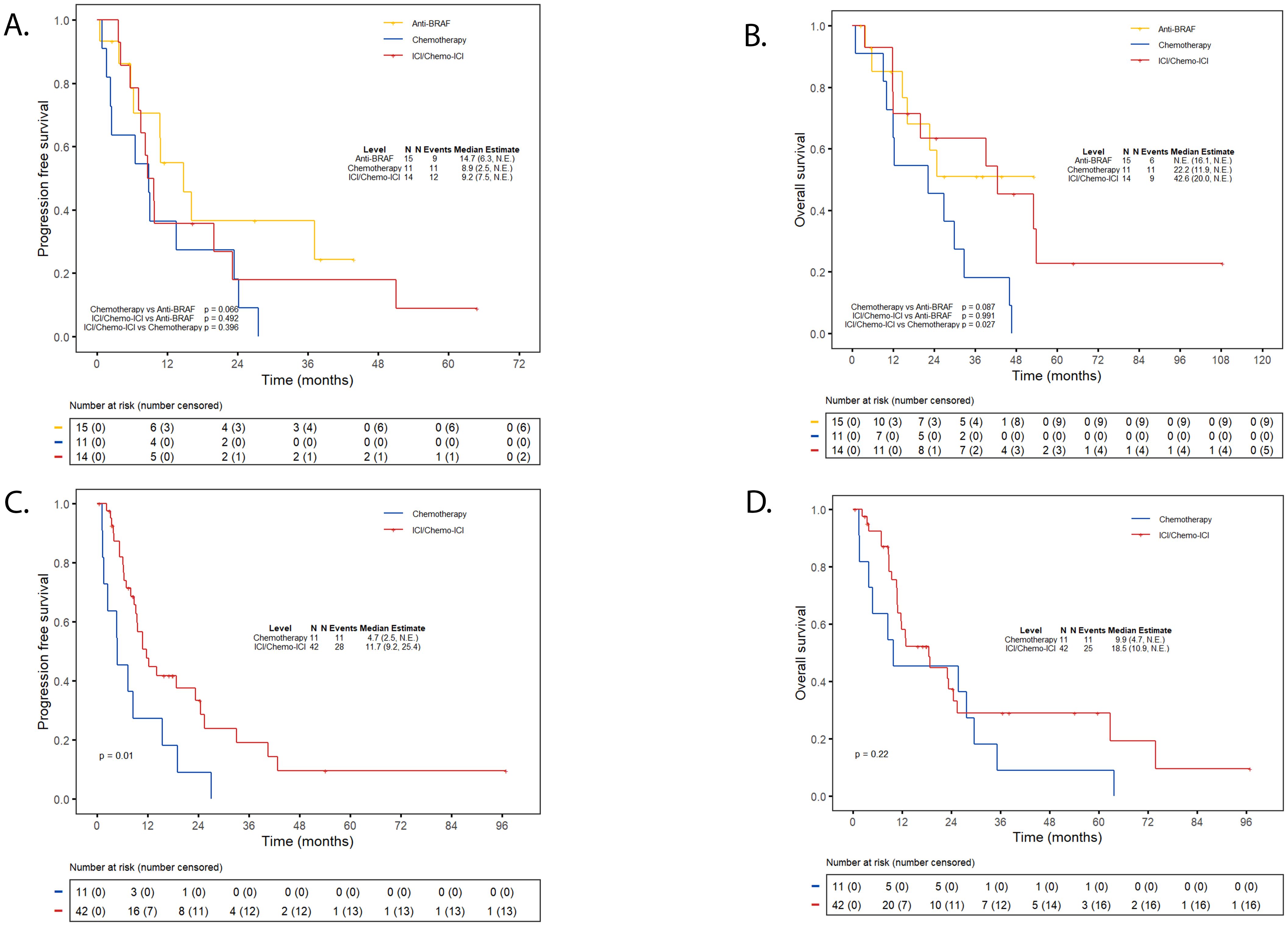 Figure 3. Progression-free survival and overall survival first-line immunotherapy. (A) PFS ICI/chemo-ICI vs. targeted therapy or chemotherapy in class (I) (B) OS ICI/chemo-ICI vs. targeted therapy or chemotherapy in class (I) (C) PFS ICI/chemo-ICI vs. chemotherapy in non-class (I) (D) OS ICI/chemo-ICI vs. chemotherapy in non-class (I) Kaplan Meier Curves depicting progression-free survival (PFS) for individuals with class I BRAF mutations treated with frontline ICI-based therapy compared to anti-BRAF/MEK therapy or chemotherapy-alone (A) Overall survival (OS) for individuals with class I treated with frontline ICI-based therapy compared to anti-BRAF/MEK therapy or chemotherapy-alone (B) PFS for individuals with non-class I mutations treated with frontline ICI-based therapy compared to chemotherapy-alone (C) OS for individuals with non-class I mutations treated with frontline ICI-based therapy compared to chemotherapy-alone (D) ICI, immune checkpoint inhibitor; NE, Not Estimable.