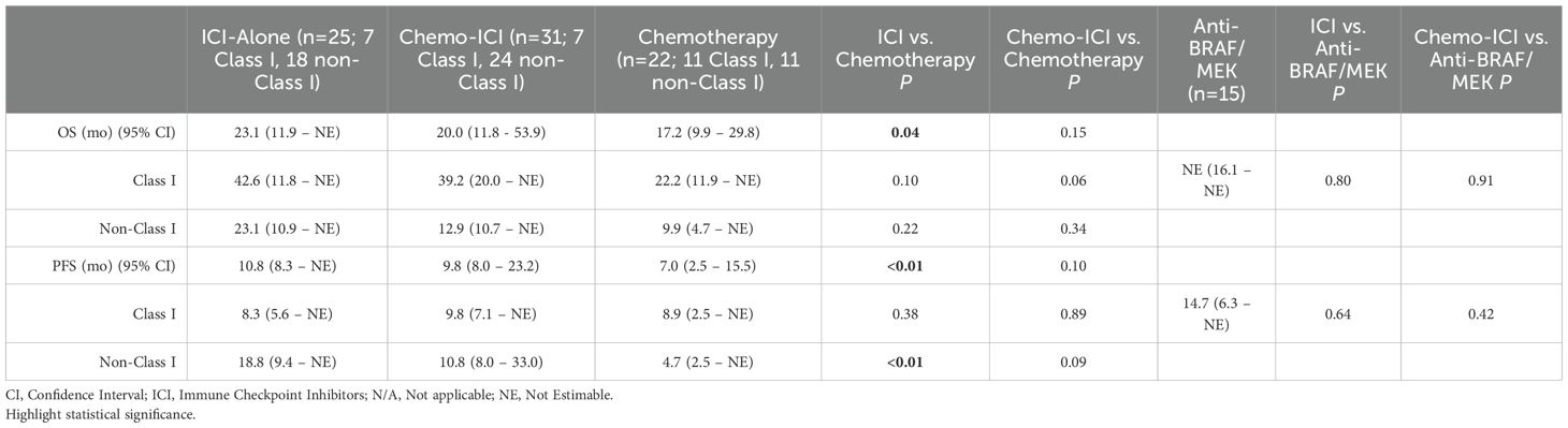 Given the limited number of patients with CNS involvement, formal comparisons across treatment arms were not feasible. In those treated with ICI-based therapies (n=8), however, OS was significantly shorter for patients with CNS involvement (12.4 months) than without CNS involvement (24.6 months; p = 0.05; Supplementary Figure 5S, Supplementary Table 5S). In patients without CNS involvement, ICI-based therapies were particularly beneficial for individuals with Class I mutations (n=13). PFS and OS in this subgroup (9.7 and 42.6 months, respectively) were comparable to those observed with anti-BRAF/MEK therapy (n=15) (PFS 14.7 months, p = 0.61; OS NE, p = 0.86) while OS was significantly improved compared to chemotherapy (n=7) (26.9 months; p = 0.03). In those with non-Class I mutations and no CNS involvement, the benefit of ICI/chemo-ICI (n=35) was less pronounced. PFS however, remained significantly longer compared to chemotherapy (n=10) (11.7 vs. 6.1 months; p=0.02) and OS showed a non-significant trend toward improvement (23.1 vs. 17.8 months; p=0.24) (Table 2).