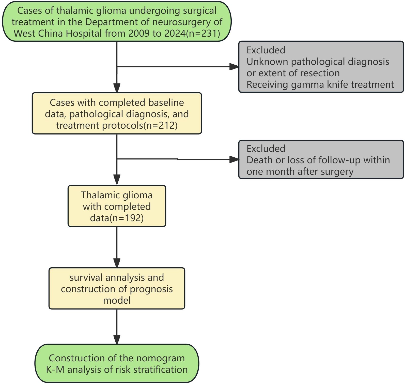 Medical records of patients who underwent craniotomy to remove thalamic space occupying lesions at the Department of Neurosurgery, West China Hospital, Sichuan University from 01/03/2009 to 01/03/2024 and were pathologically confirmed as glioma were reviewed and collected. Patients lacking critical information such as age, gender, pathological diagnosis, treatment protocol (surgery only, surgery and postoperative radiotherapy/chemotherapy, surgery and postoperative chemoradiotherapy), and OS and outcome were excluded. Patients who died within 1 month after surgery were excluded. The remaining patients were divided into surgery group, surgery and postoperative radiotherapy/chemotherapy group, and surgery and postoperative chemoradiotherapy group according to the treatment regimen they received(considering that the number of cases of postoperative radiotherapy and postoperative chemotherapy is relatively small, the two are combined into one group). The specific inclusion and exclusion process is shown in Figure 1. This study has been approved by the Ethics Review Committee of West China Hospital of Sichuan University, before accessing the data, all data had been completely anonymized, authors had no access to information that could identify individual participants during or after data collection, and the ethics committee waived the informed consent requirement.