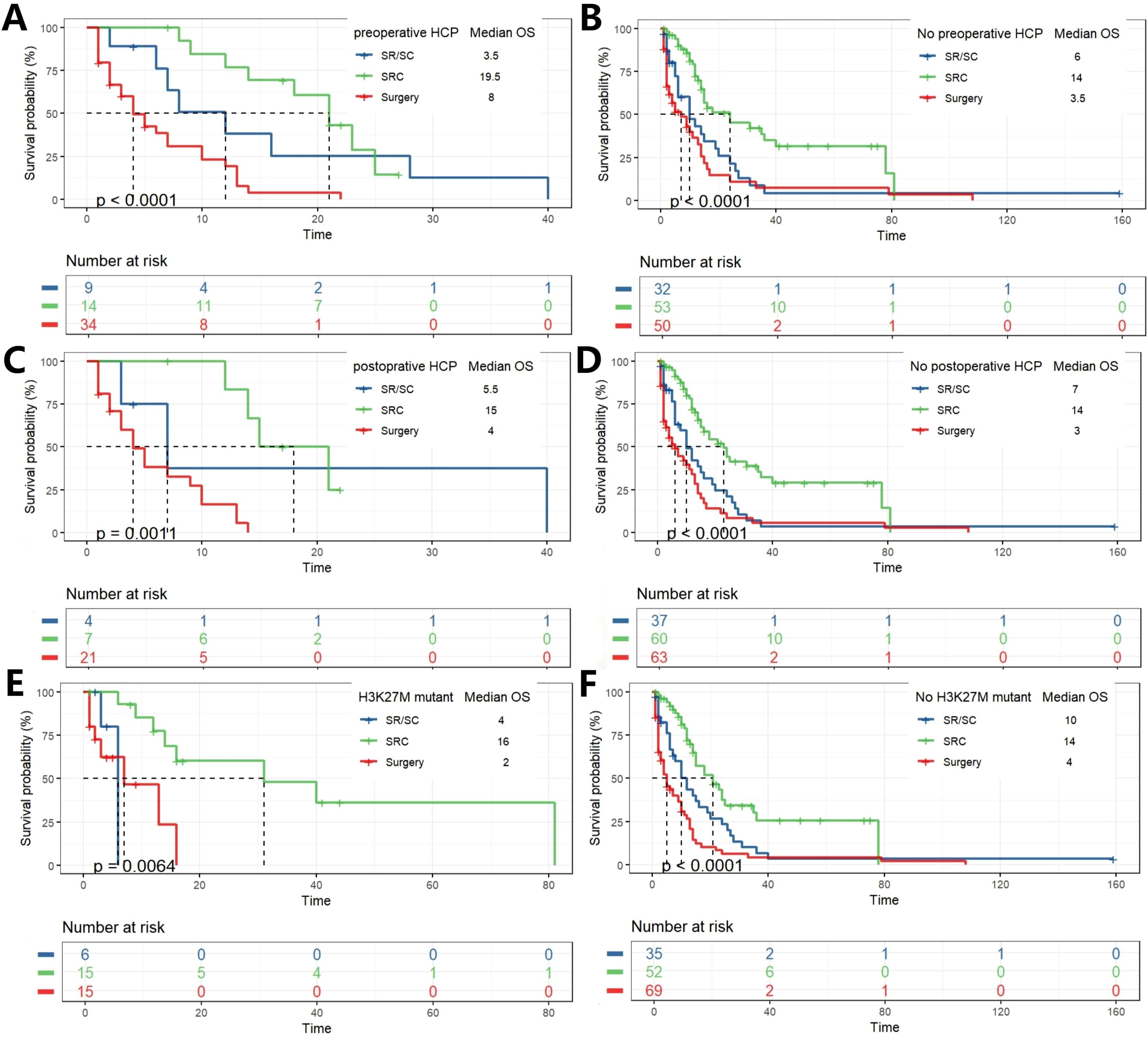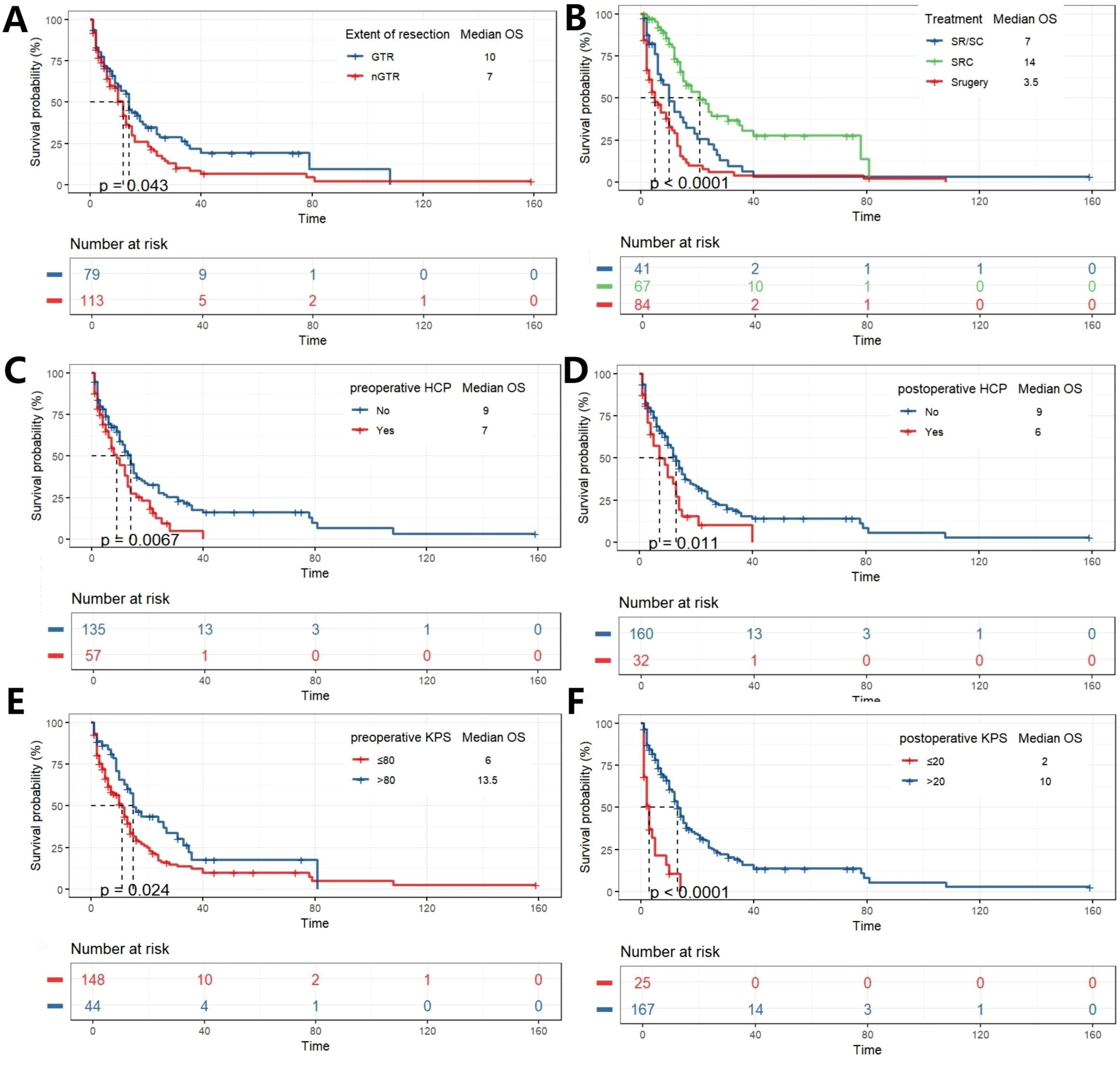 Figure 2. K-M analysis determining the impact of variables on OS (months). Stratified by EOR (A), Treatment (B), Preoperative HCP (C), postoperative HCP (D), preoperative KPS (E), and postoperative KPS (F).