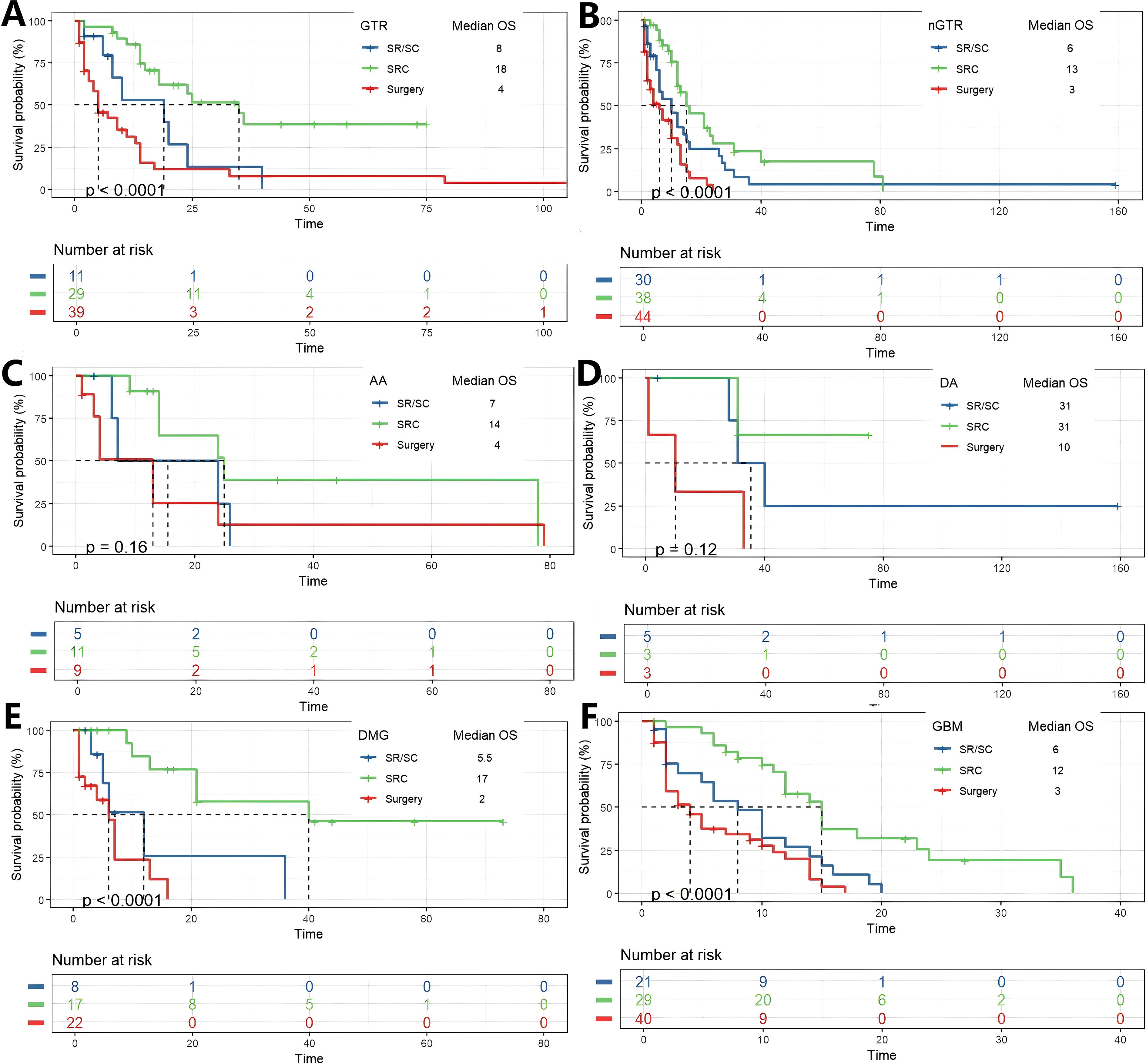 Figure 3. K-M analysis determining the impact of different treatments on OS(months) in subgroups. Grouped by EOR (A, B), and diagnosis of AA, DA, DMG and GBM.(C-F).