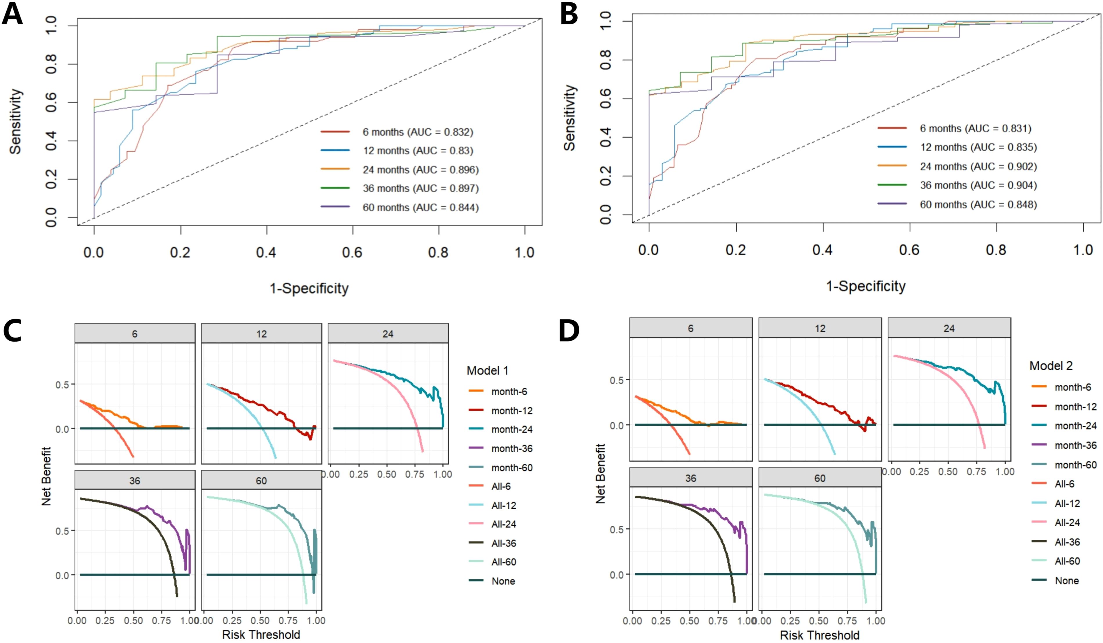 Figure 5. Comparison of time-ROC curve and DCA curve between Model 1 and Model 2. Time-ROC of Model 1 shows a good classification performance (A), while Model 2 is better than Model 1 (B). DCA curve shows Model 2 has a higher clinical application value than Model 1 (C, D).