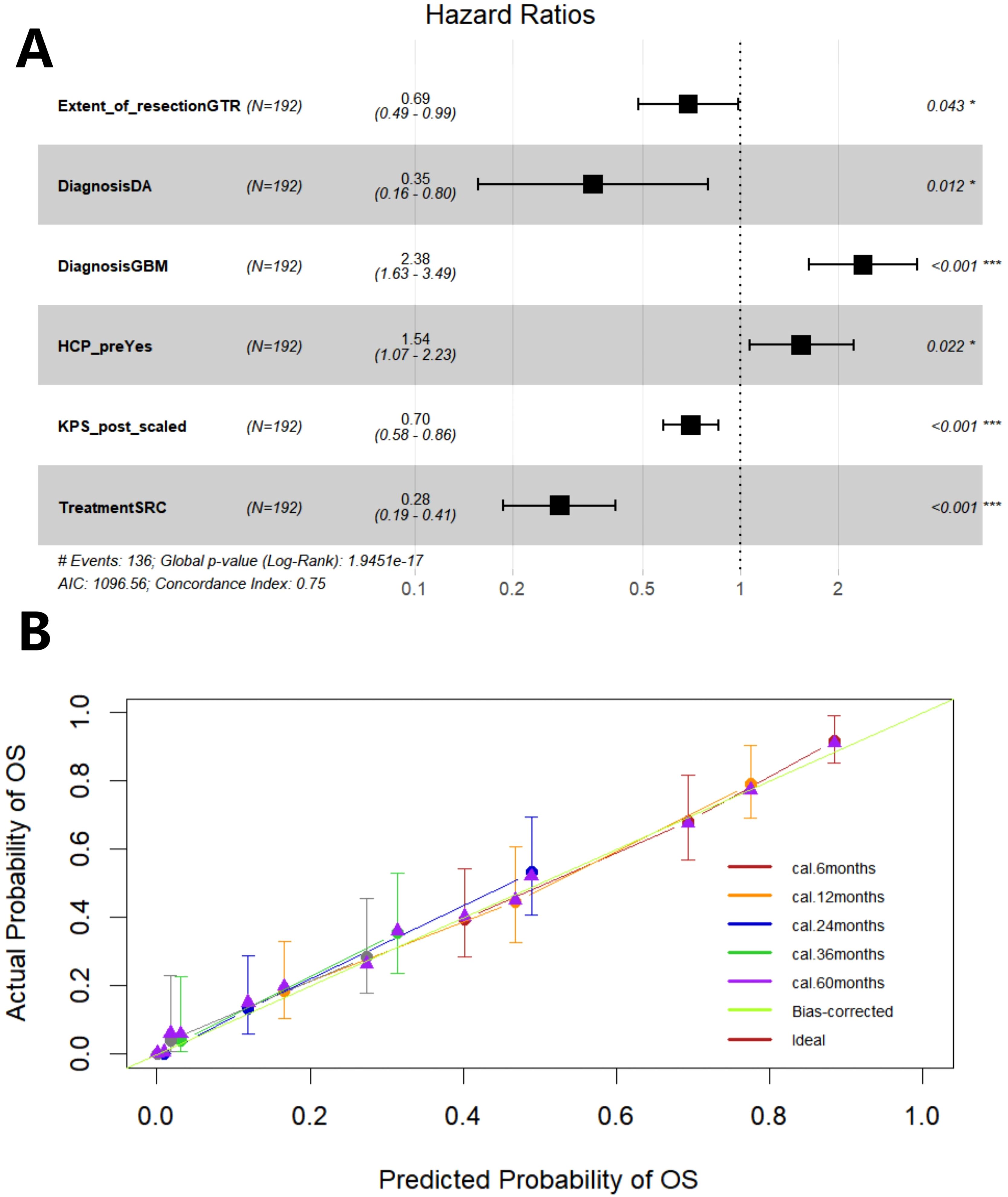 Figure 6. The forest plot shows the hazard ratio of the variable and the 95% confidence interval (A). Calibration curve of Model 2 (B). GTR, gross total resection; DA, diffuse astrocytoma; GBM, glioblastoma; HCP, hydrocephalus; KPS, Karnofsky Performance Scale score; SRC, surgery + radiochemotherapy.
