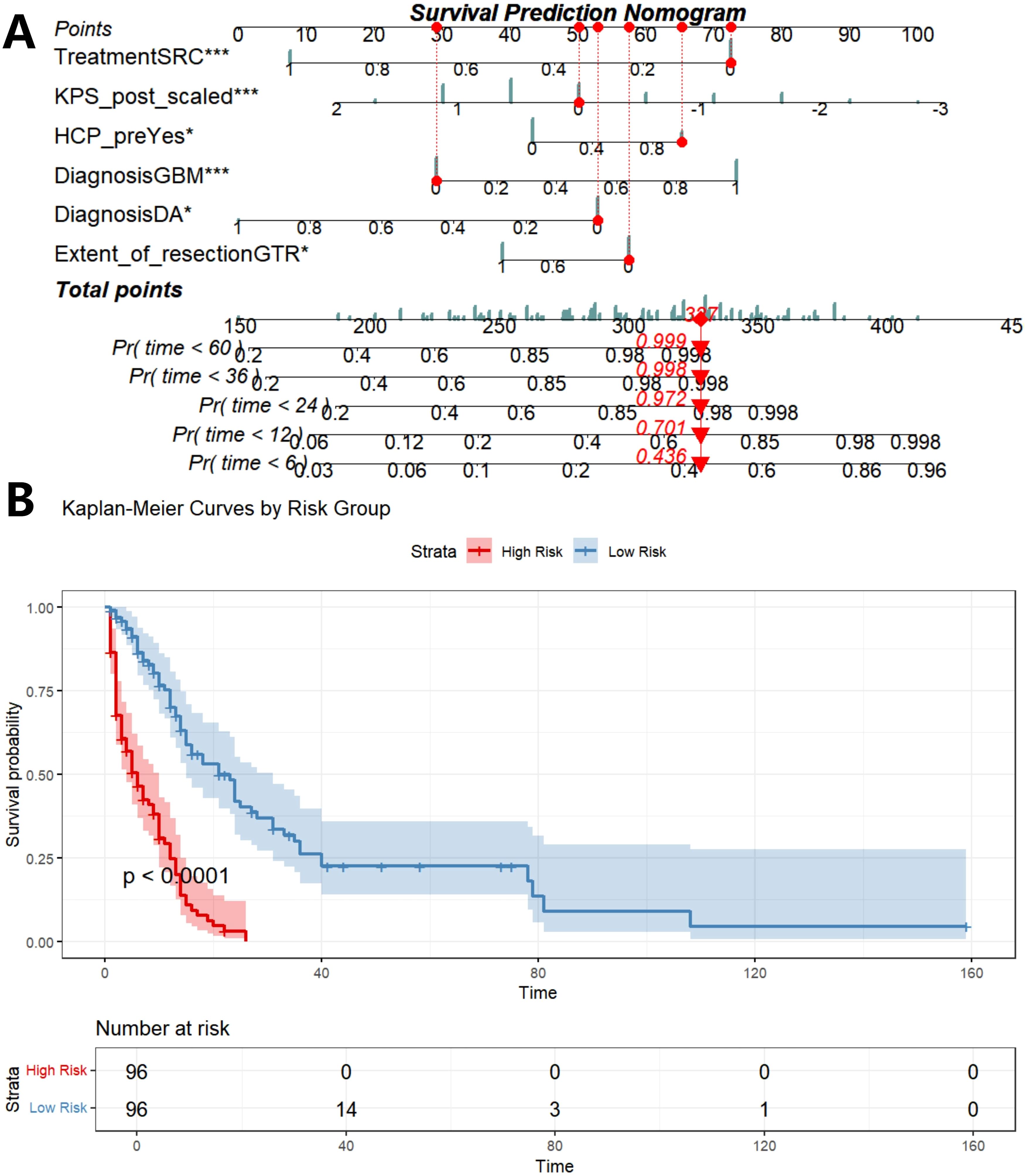 Figure 7. Construction of prognostic nomogram based on five independent prognostic factors (A), K-M analysis determined the impact of risk stratification on OS based on prognostic nomogram (B). SRC, surgery combined with chemoradiotherapy; SR/SC, surgery combined with radiotherapy or chemotherapy; KPS_post, postoperative KPS score; HCP_pre, preoperative HCP; DA, diffuse astrocytoma; AA, anaplatic astrocytoma; DMG, diffuse midline glioma; GBM, glioblastoma; Pr, probability.