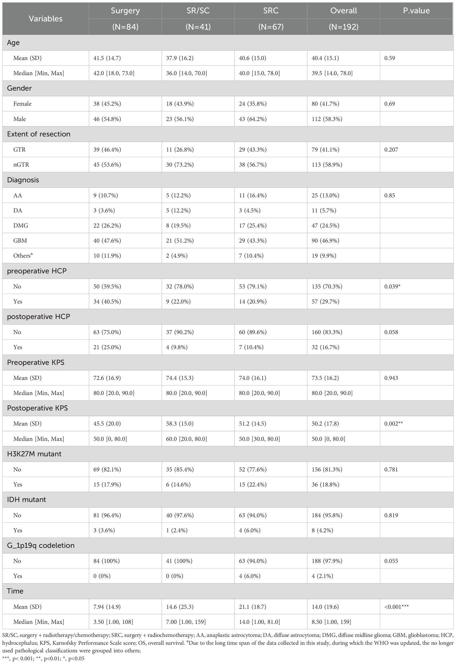 Patient characteristics and covariates included age, gender, tumor characteristics (pathological diagnosis, molecular characteristics), degree of resection (gross total resection, non-gross total resection), treatment plan (surgery, SR/SC, SRC), preoperative and postoperative hydrocephalus, preoperative and postoperative KPS scores, OS (months), and survival status. Pathological diagnoses include anaplastic astrocytoma(AA), diffuse astrocytoma(DA), diffuse midline glioma(DMG), glioblastoma(GBM), and others. The molecular characteristics of tumor included IDH mutation, H3K27M mutation and chromosome 1p/19q co-deletion. GTR was determined based on a combination of intraoperative assessment by the surgical team and postoperative MRI evaluation indicating no apparent abnormal tumor tissue. The postoperative KPS score was assessed consistently at 2 weeks after surgery. The primary outcome of this study was OS. OS was defined as the time interval between diagnosis and last follow-up or death from any cause. Survival status was recorded at the last follow-up or confirmation of patient death.