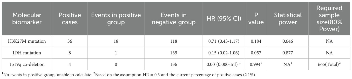 In addition to the primary multivariable Cox proportional hazards model, we performed supplementary analyses on three molecular pathological markers—H3K27M mutation, IDH mutation, and 1p/19q codeletion—to comprehensively assess their prognostic value. First, univariable Cox regression analyses were conducted to evaluate the independent prognostic significance of each marker. Subsequently, we performed statistical power analyses to evaluate the ability of the current sample size to detect the effects of these molecular alterations. Power calculations were based on the observed effect sizes and event distributions. For 1p/19q codeletion, due to the absence of event occurrences in the positive group, the required sample size for detecting such an effect was estimated based on an assumed HR of 0.3.
