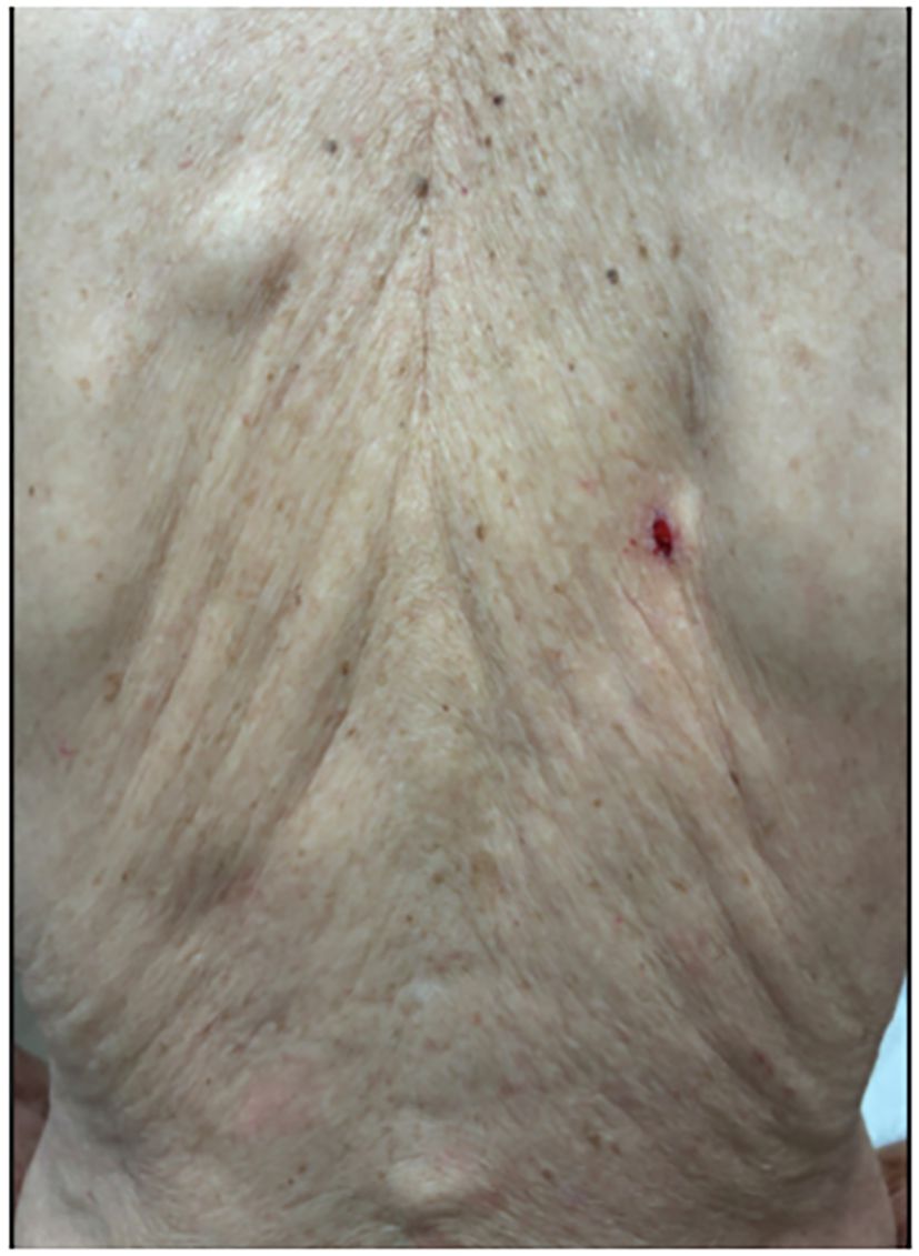 The pathways of prostate cancer metastasis to the skin are not well-understood due to its rarity. Possible routes include lymphatic or hematogenous spread for distant disease and direct extension to the skin from an underlying prostate cancer (9). It has been theorized that serine proteases, specifically human tissue kallikreins, may facilitate dermal extravasation by disrupting epidermal adhesions (10). We surmise that in our patient’s case, he developed spine and dermal metastases via hematogenous spread, as his fluorodeoxyglucose (FDG) PET/CT scan did not reveal any other metastatic lesions that would have extended directly to the dermis of his right mid-back.