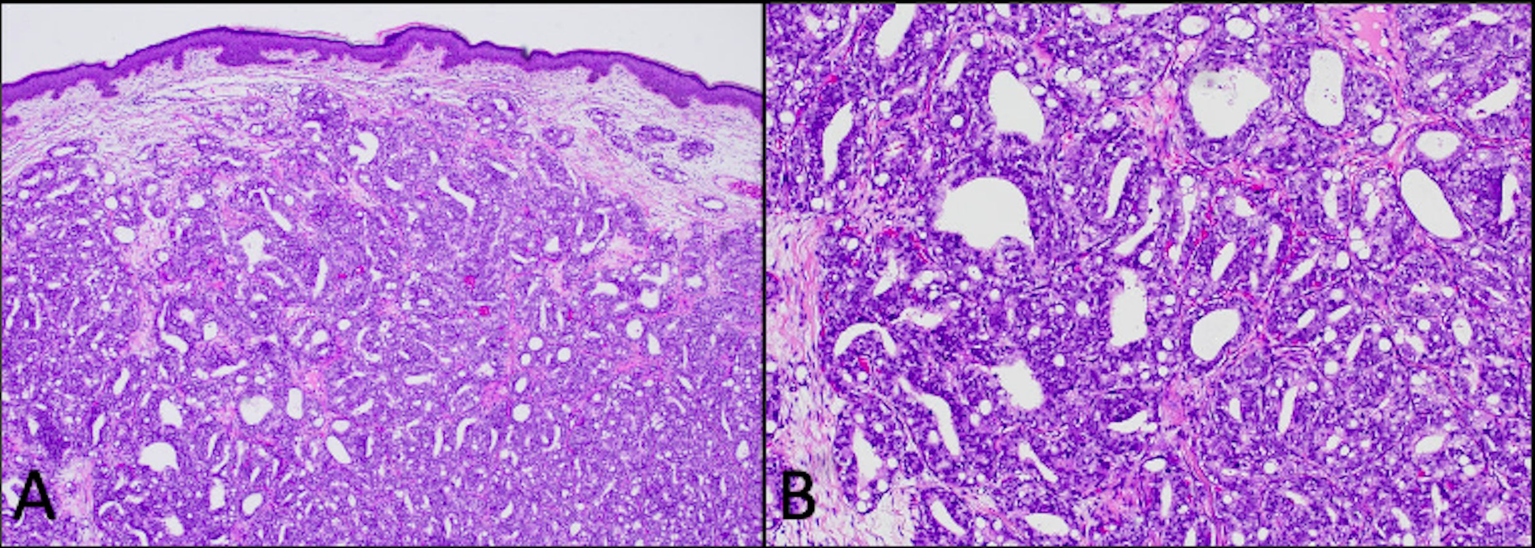 Figure 2. Hematoxylin and eosin (H&E)-stained punch biopsy of the edge of the ulcer revealed a dermal-based malignant glandular tumor [(A) 4×] with mucin production [(B) 100×].