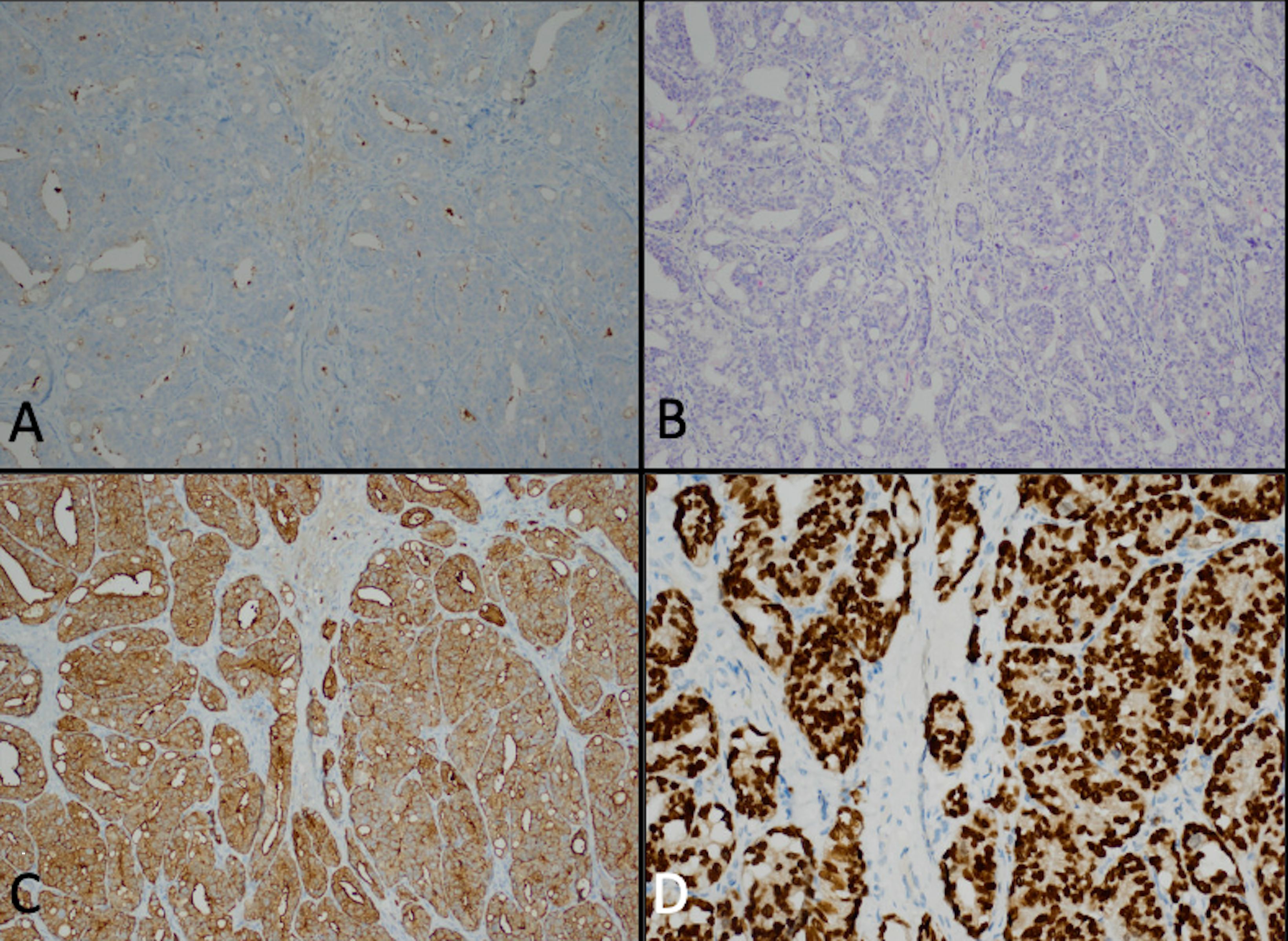 Figure 3. Punch biopsy of the edge of the ulcer revealed weak staining for PSA (A) and PIN4 (B) as well as strong expression of PSAP (C) and NKXC3 (D).