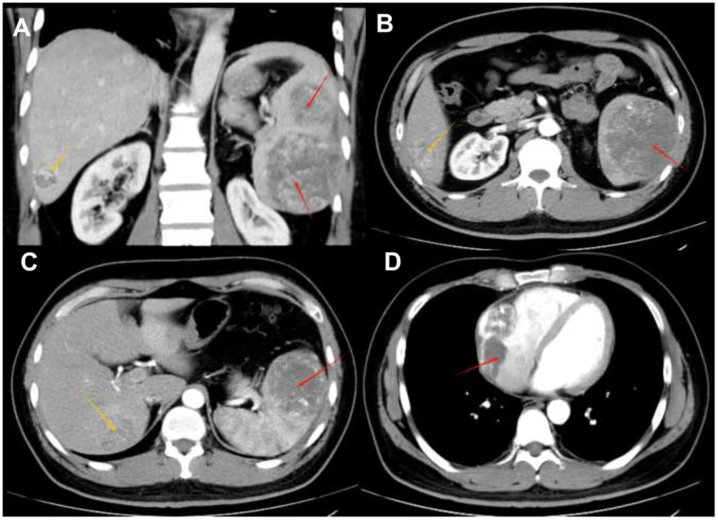Figure 1. Radiological findings (A) A tumor within the spleen can be seen compressing the left kidney in the coronal position. (B) Contrast-enhanced CT shows multiple circular mixed-density lesions in the spleen. The size of the lesion in the inferior pole of splenic area is approximately 7.3 cm×6.3 cm×13.6 cm (indicated by the red arrow). Unevenly enhanced lesions can be seen in the V segment of the liver, approximately 3.7 cm×4.1 cm×4.5 cm in size (indicated by the yellow arrow) —consistent with typical SA liver metastasis. (C) An unevenly enhanced lesion with a size of approximately 4.1 cm×4.0 cm×3.5 cm (indicated by the yellow arrow) can be seen in segment VII of the liver. The lesion in the superior pole of the spleen is approximately 7.3cm×6.8cm×7.0cm in size (indicated by the red arrow). (D) Contrast-enhanced CT shows an unevenly enhanced lesion in the right atrium, with a maximum diameter of 7.1 cm (as indicated by the red arrow) —a rare metastatic site in SA, reported in only 1% of cases.