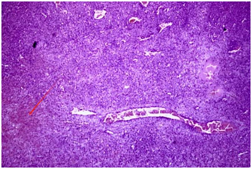 Figure 2. Postoperative pathological examination shows that the tumor was composed of atypical epithelioid cells. No cortical or medullary structures were seen in the spleen. A large number of proliferating tumor cells were observed in the field of view, and some showed necrosis (as indicated by the red arrow) —key histological features distinguishing SA from benign vascular tumors.