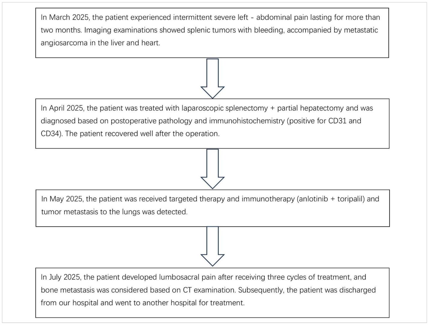 Splenectomy is the treatment of choice for SA. Regardless of whether SA patients have aggressive dissemination and metastasis or have already experienced splenic rupture, splenectomy can prolong the survival period of patients. In addition to surgery, radiotherapy, chemotherapy, and targeted immunotherapy are also important treatment methods (9). Studies have shown that the survival outcomes SA vary significantly depending on the treatment modality: 1) Surgery alone: The median overall survival (OS) of patients is 3.7–7 months, and whether splenic rupture occurs before surgery is an independent risk factor (5). This is because patients not only face the risk of immediate death due to hemorrhagic shock and disseminated intravascular coagulation, but splenic tumor rupture also promotes peritoneal dissemination and hematogenous metastasis of the tumor; 2) Surgery + chemotherapy: The European Society for Medical Oncology (ESMO) guidelines for soft tissue and visceral sarcoma recommend the use of paclitaxel/gemcitabine for the treatment of angiosarcoma. In addition, the combination of paclitaxel/gemcitabine and docetaxel can also be used as a treatment for angiosarcoma. According to the clinical practice guidelines for soft tissue sarcoma of the Japanese Orthopaedic Association, the combined application of doxorubicin and taxanes is also effective in the treatment of angiosarcoma. According to a study by Li et al. (5), after using a chemotherapy regimen postoperatively, the median overall survival is extended to 12–14 months; 3) Surgery + targeted immunotherapy: receptor tyrosine kinase inhibitors can target and bind to vascular endothelial growth factor (VEGF) receptors, thereby inhibiting tumor angiogenesis and tumor cell proliferation. PD-1 inhibitors can bind to PD-1 receptors and block their interaction with PD-L1 and PD-L2, thus releasing the suppression of immune responses mediated by the PD-1 pathway, including anti-tumor immune responses, and enabling the immune system to better attack and kill tumor cells. The NCCN Clinical Practice Guidelines in Oncology: Soft Tissue Sarcoma recommends the combination of anti-angiogenic drugs and PD-1 inhibitors for advanced unresectable or metastatic soft tissue sarcomas (especially subtypes such as angiosarcoma and synovial sarcoma) (23), stating that this combination can improve efficacy and has better safety than traditional chemotherapy. Xu et al. (6)reported that 1 patient with metastasis achieved CR after six cycles of targeted immunotherapy. This case confirms that immune checkpoint inhibition and anti-angiogenesis have a synergistic effect. Meanwhile, the Ki-67 index of this patient is approximately 30%, suggesting a high tumor proliferation activity. Therefore, this patient received the targeted immunotherapy regimen of anlotinib + toripalimab. Regrettably, the patient developed lumbosacral pain after receiving three cycles of treatment, and bone metastasis was considered based on CT examination. Subsequently, the patient was discharged from our hospital and went to another hospital for treatment, so we were unable to continue the follow - up. This is a shortcoming of this article.