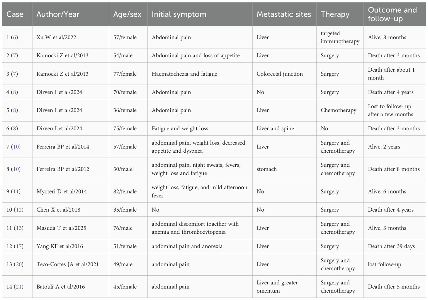 Case reports of SA highlight the complexity and aggressiveness of this rare malignancy. In the context of relevant literature, we summarized the initial symptoms, metastatic sites, therapy, and outcome and follow-up of this disease (Table 2), with the aim of providing valuable insights for clinicians in the diagnosis and management of this rare condition.