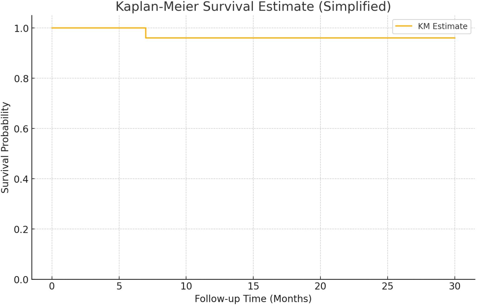 The cohort included 25 patients, 18 males and 7 females with a median age of 70 years. Most patients were classified as high-risk (13), followed by intermediate (10), and very high (2). Primary tumors were observed in 11 patients, while 14 had recurrent disease. Only one patient experienced recurrence during follow-up, after the 3 months of the therapy, resulting in an overall recurrence rate of 4%. This patient belonged to the intermediate-risk group and had a primary tumor. No recurrences occurred in high- or very high-risk groups. Kaplan-Meier analysis showed high survival probability across all groups, with a minor drop in the intermediate-risk group (Figure 1). The median follow-up duration was 16 months (range 7–30 months). In five patients, the intravesical installation protocol was not completed. The reasons for discontinuation were as follows: one patient experienced tumor recurrence during therapy; one patient required active treatment for concurrent prostate cancer; one patient developed persistent hematuria; and two patients discontinued due to loss of compliance. Additionally, one patient was diagnosed with genitourinary tuberculosis involving the prostate. This patient was also found to have synchronous lung cancer.
