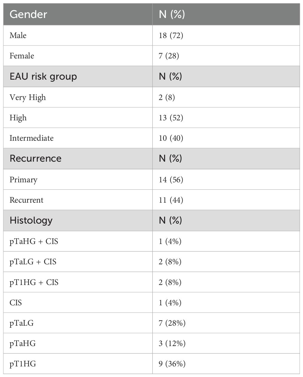 This retrospective study included 25 patients diagnosed with intermediate- and high-risk NMIBC, with or without CIS, who received sequential intravesical therapy with BCG followed by MMC between August 2022 and April 2024. Risk stratification followed the criteria outlined by the European Urological Association (Table 1). Patients were included if they had complete data on treatment and follow-up.