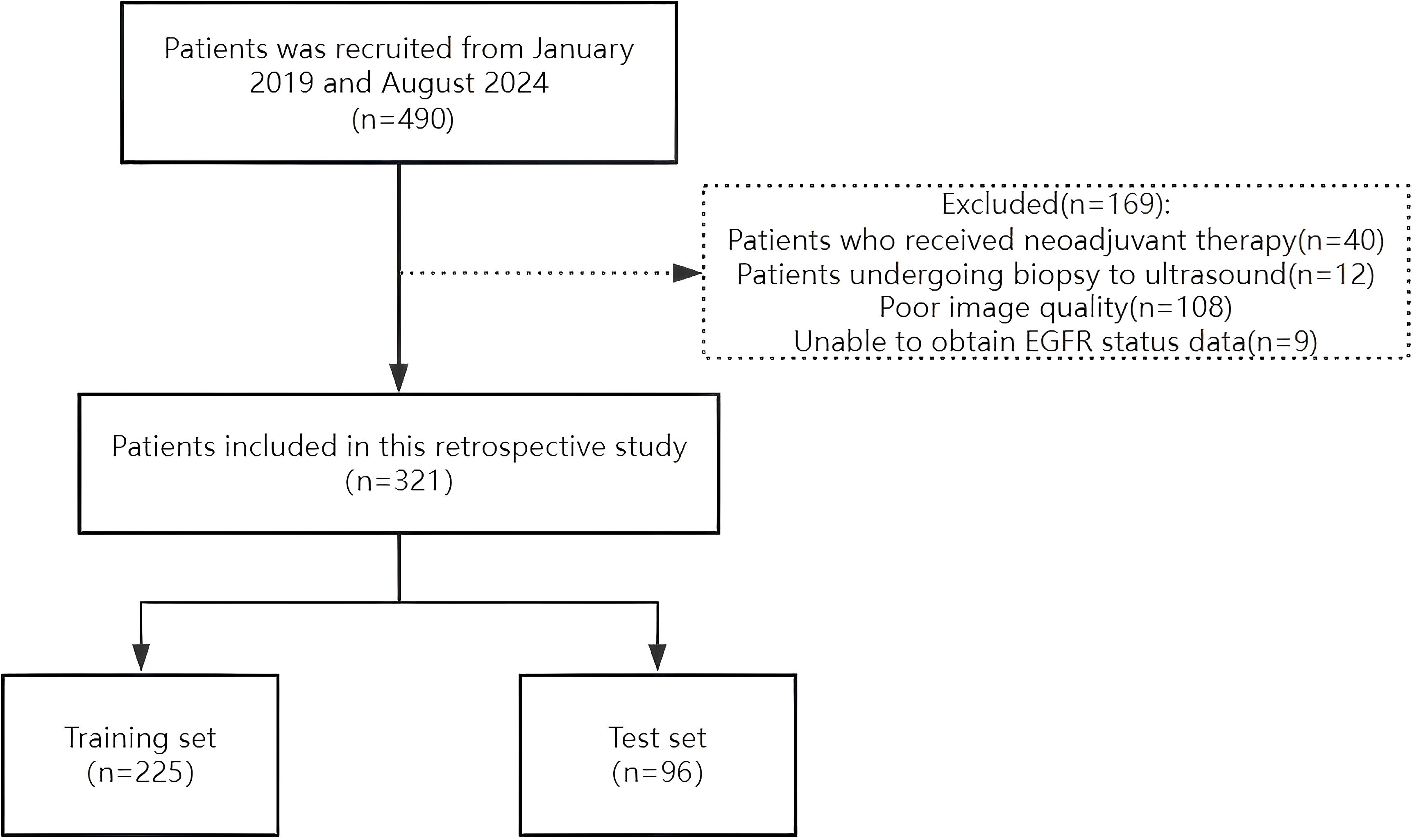 The Ethics Committee of the Second Affiliated Hospital of Fujian Medical University approved this study (Approval No. 021) on 26 March 2025, and all patients provided written informed consent. A retrospective analysis was conducted on female patients diagnosed with breast cancer through surgical pathology who underwent EGFR gene testing at our institution between January 2019 and August 2024. The inclusion criteria were 1) patients who underwent grayscale ultrasound and 2) those who underwent ultrasound examination within 2 weeks prior to genetic testing. The exclusion criteria were as follows: 1) patients who received neoadjuvant chemotherapy, 2) patients who underwent biopsy before the ultrasound examination, and 3) patients with unclear ultrasound images. A total of 321 grayscale ultrasound images from eligible patients were analyzed. These patients were randomly divided into training (n = 225) and test (n = 96) sets at a 7:3 ratio (Figure 1). To reduce selection bias beyond a single hold-out split, we additionally performed stratified 10-fold cross-validation, preserving the EGFR+/– ratio in each fold. Mean AUC, accuracy, precision, recall, and F1-score across folds were computed and reported. Clinical information of each patient was recorded, including age, maximum tumor diameter, tumor morphology, taller-than-wide orientation, presence of microcalcification, posterior acoustic attenuation, blood flow signals, and EGFR expression status. To preserve the class distribution (EGFR–:EGFR+ ≈ 2:1), all data partitions employed stratified sampling.