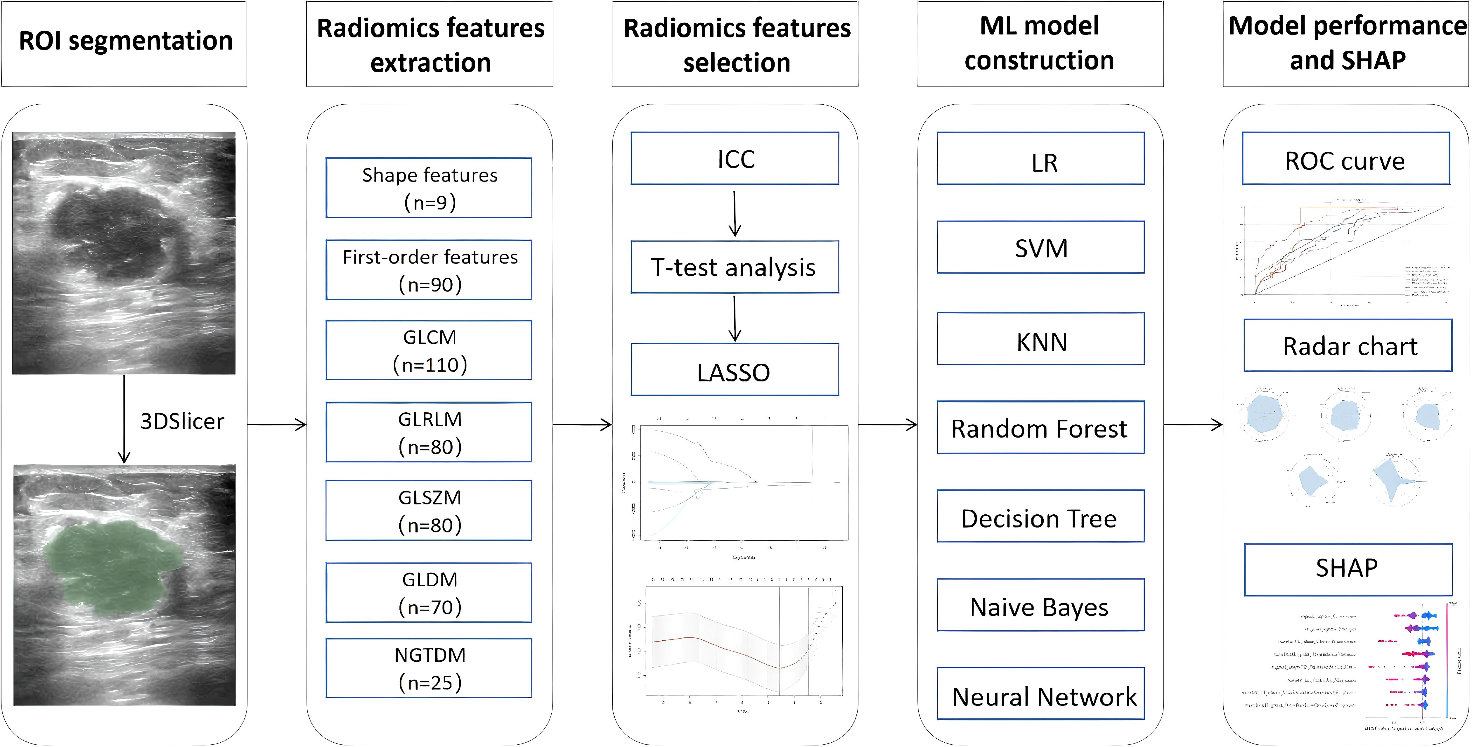 AUC, area under the ROC curve; DT, decision tree; EGFR, epidermal growth factor receptor; ER, estrogen receptor; GLCM, gray-level co-occurrence matrix; GLRLM, gray-level run-length matrix; GLSZM, gray-level size zone matrix; HER2, human epidermal growth factor receptor 2; ICC, intraclass correlation coefficient; IHC, immunohistochemistry; Ki-67, cell proliferation index; KNN, k-nearest neighbors; LR, logistic regression; ML, machine learning; NB, naive Bayes; NGTDM, neighborhood gray-tone difference matrix; NN, neural network; ROC, receiver operating characteristic; ROI, regions of interest; RF, random forest; SVM, support vector machine; SHAP, Shapley additive explanation; TMA, tissue microarray.