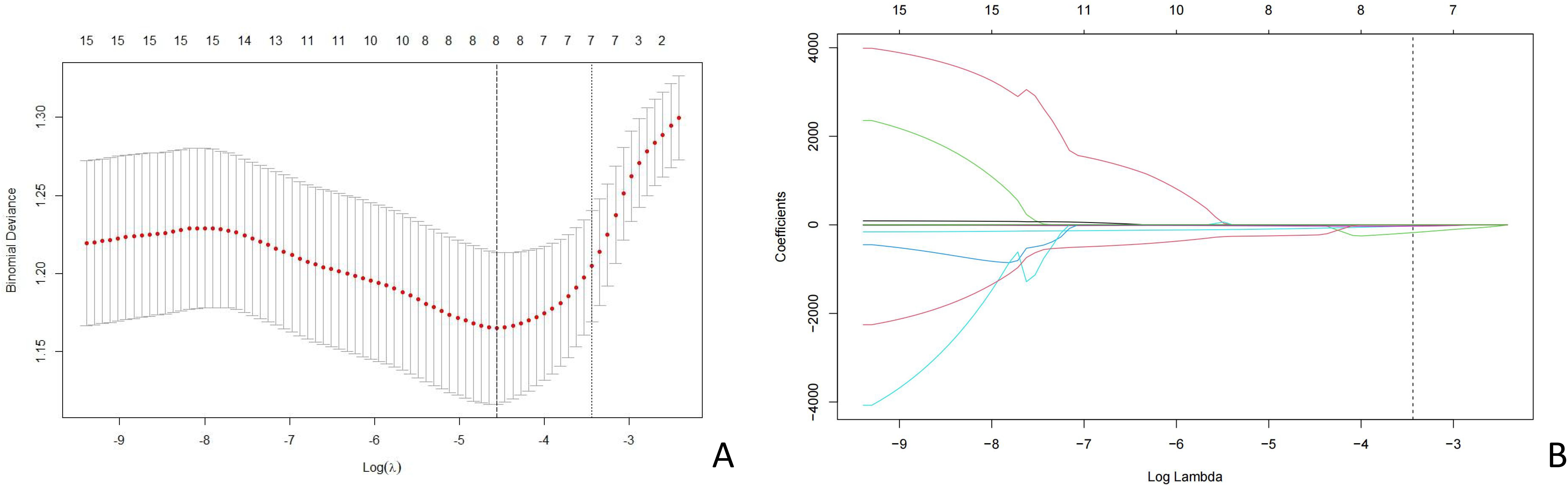 Figure 3. LASSO coefficient profiles of the risk factors. (A) Distribution of the coefficients of 16 features after LASSO regression. (B) Cross-validation curve used to determine the optimal regularization parameter (λ). LASSO, least absolute shrinkage and selection operator.