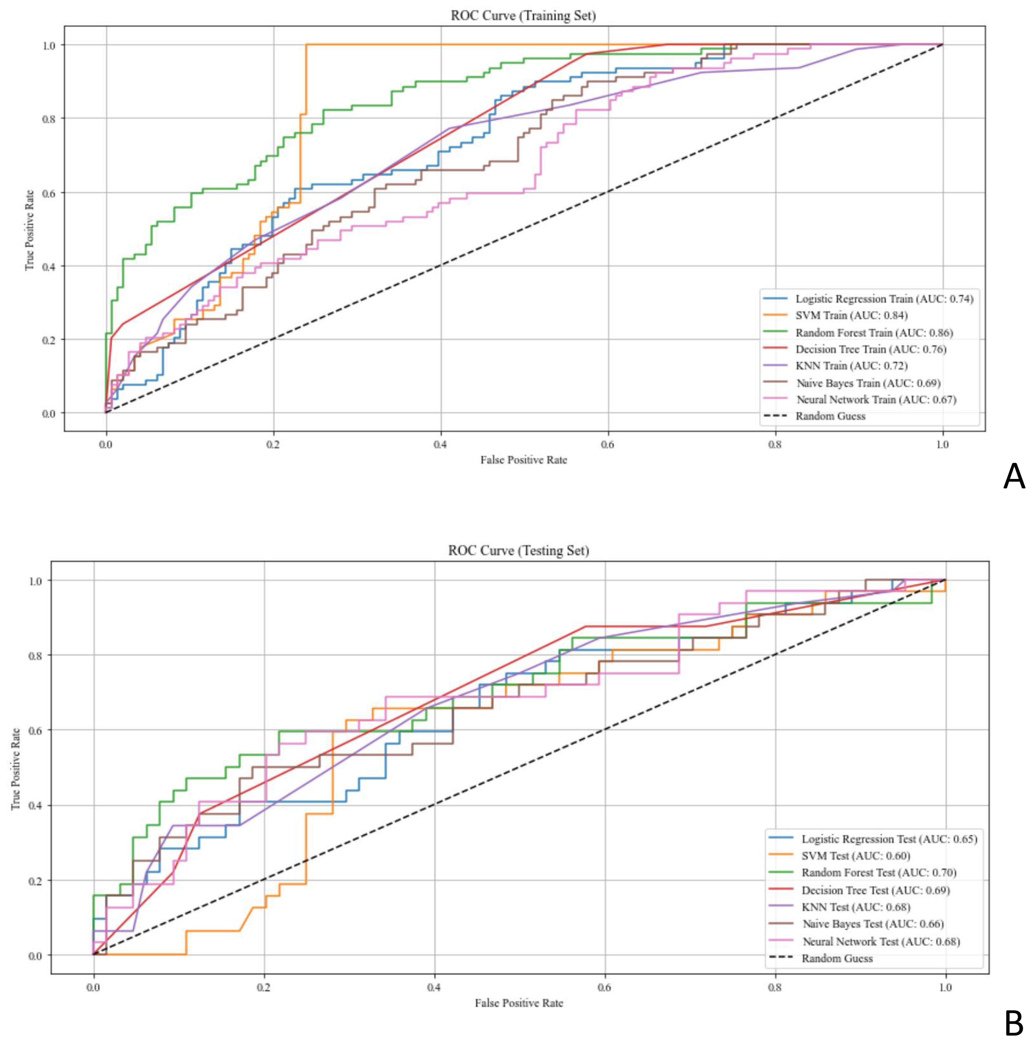 Figure 4. ROC curves assessing the performance of ML models for predicting EGFR status in patients with breast cancer. (A, B) ROC curves of the ML models in the (A) training set and (B) test set. AUC, area under the curve; EGFR, epidermal growth factor receptor; ML, machine learning; ROC, receiver operating characteristic.