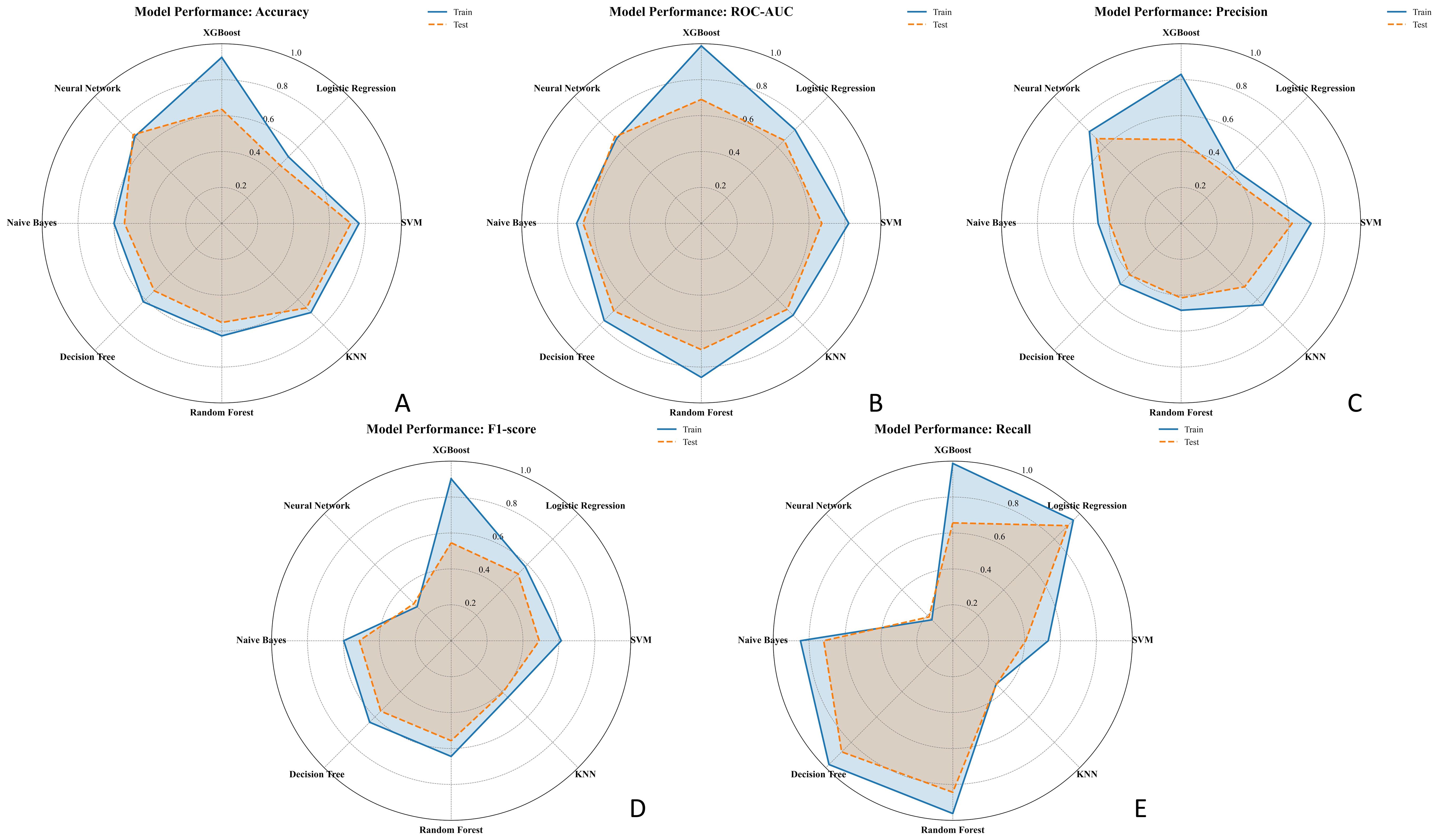 An exploratory soft-voting ensemble achieved performance comparable to RF (10-fold AUC 0.73 ± 0.10 vs. RF 0.82 ± 0.08; hold-out AUC both 0.76), suggesting limited incremental benefit on this dataset (Supplementary Table S2). The radar plots in Figure 5 illustrate model performance metrics (AUC, accuracy, precision, recall, and F1-score) across classifiers, highlighting that Random Forest and XGBoost achieved the best overall generalization on both training and test sets.