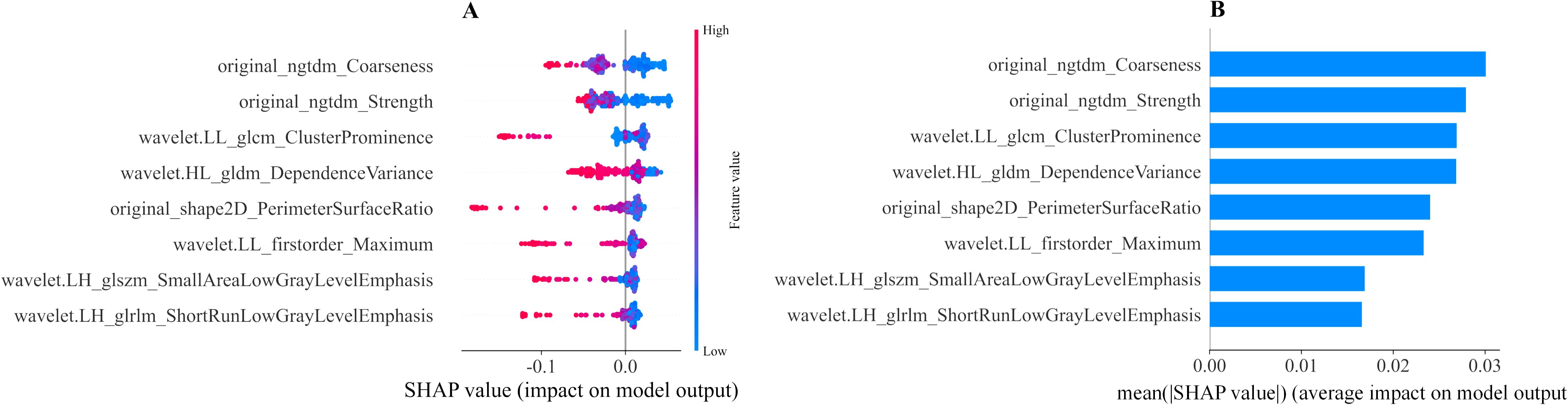 Figure 6. Interpretability of the ML radiomic model assessed using the SHAP method. (A) SHAP summary plot showing the impact of each feature on the model’s predictions. Individual dots represent patients, with different colors indicating varying levels of influence on the model’s output. (B) SHAP bar chart displaying the importance of each feature based on mean SHAP values. ML, machine learning; SHAP, Shapley additive explanation.