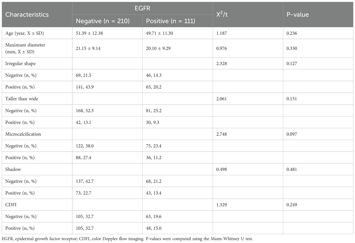 In total, 321 patients with breast cancer were included in the study, of whom 111 (34.6%) had EGFR+ status and the remaining 210 (65.4%) had EGFR- status. There were no significant differences between the groups in terms of age, maximum tumor diameter, irregular shape, height-to-width ratio, presence of microcalcifications, posterior shadowing, or blood flow signals (Table 1). No statistically significant differences were found based on t-test for continuous variables and chi-square test for categorical variables.