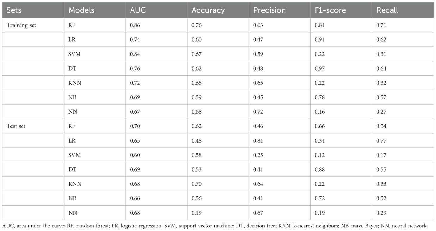 The selected features were input into the seven ML models. The performance of these models was evaluated using ROC curves for both the training and test sets (Figure 4; Table 2). In the training set, the LR model achieved an AUC of 0.74. Delong’s test indicated that the RF model had the highest AUC, significantly outperforming the LR, SVM, DT, KNN, NB, and NN models (P < 0.001). In the test set, the RF model (AUC = 0.70) outperformed the SVM model (AUC = 0.60, P < 0.05). Radar plots were used to visualize the relative importance of selected features across different models. However, no significant differences were observed between the RF model and the LR, KNN, DT, NB, and NN models (P > 0.05). Although several between-model differences on the hold-out test were not statistically significant, cross-validation showed that RF delivered balanced performance with a higher mean F1-score (0.54 ± 0.12) on average, supporting its selection as the final model. Beyond the 7:3 hold-out test (RF AUC = 0.76; F1 = 0.58), stratified 10-fold cross-validation yielded consistent performance (AUC 0.82 ± 0.08; F1 0.54 ± 0.12), supporting model robustness (Supplementary Table S4).