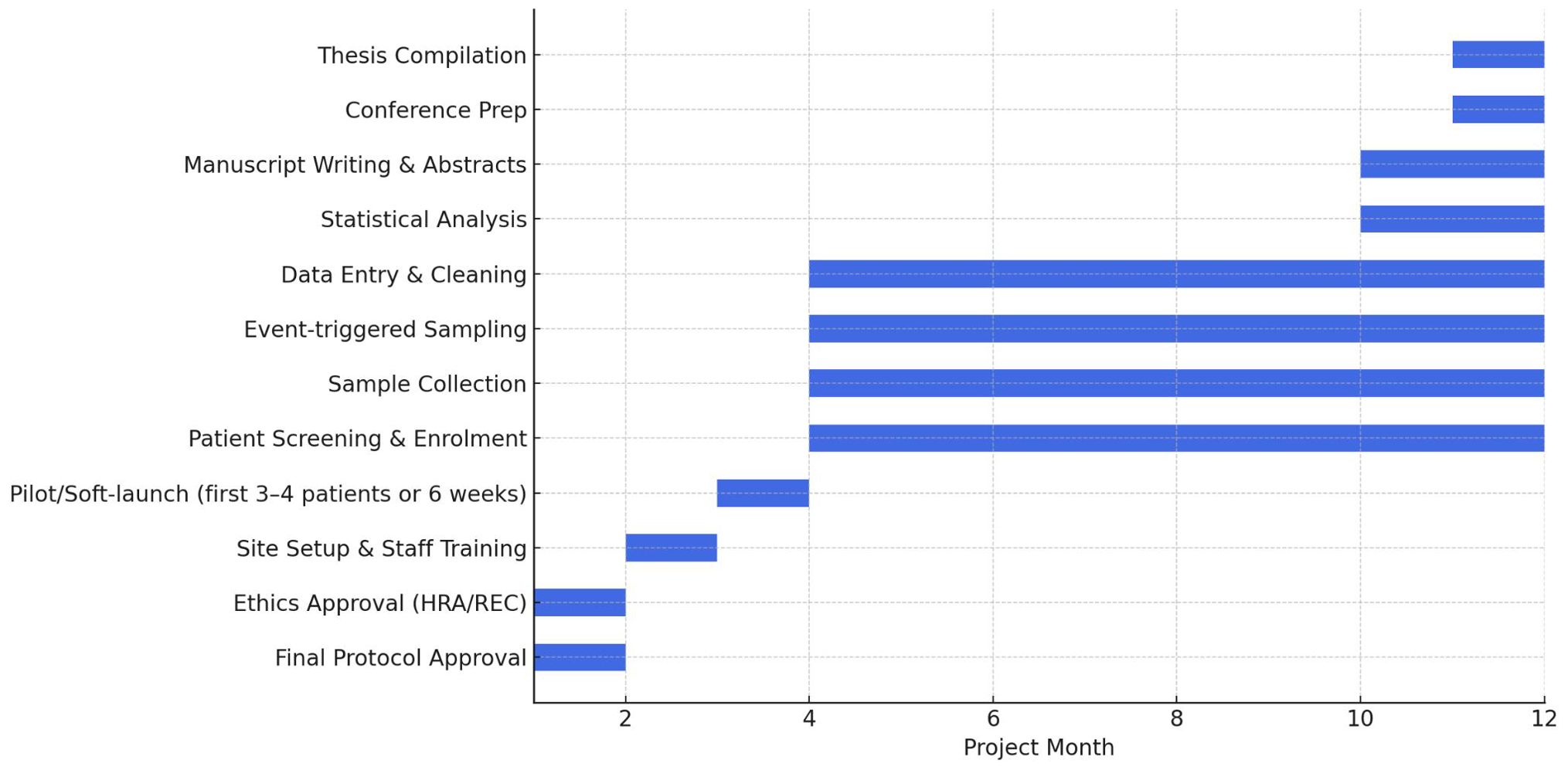 ● Duration: 12–18 months. The overall project timeline, including patient recruitment, sample collection, data analysis, and dissemination activities, is illustrated in Figure 1.