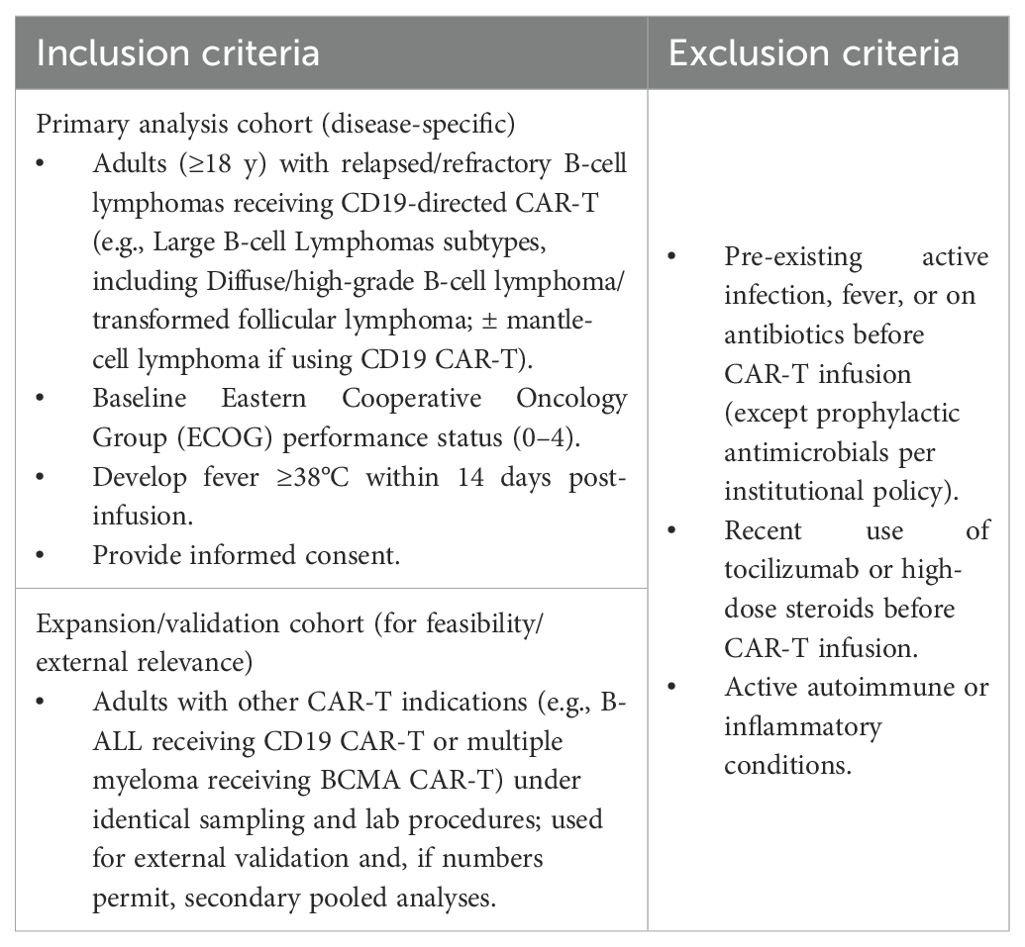 ● The proposed ratio (IL-6/PCT) will be monitored over 14 days (from pre-CAR-T to D14 post-infusion) at multiple sampling times, which will be discussed in detail in the later paragraphs. We will follow IL-6 and PCT for 14 days to capture infections that often arise after the first week post–CAR-T, when CRS predominates; this extended window reduces time-related confounding and misclassification, yielding less biased accuracy estimates (17, 30–32). It is worth noting that no treatment or intervention decision will be made based on this ratio during its observation. However, the patient’s treatment will be guided purely by the current evidence-based practice and local guidelines. Therefore, in this observational exploratory study, it is not necessary to obtain the biomarker results at specific time points. However, we will analyse the data retrospectively, using results as they become available in the database, with clinical adjudication of sepsis versus CRS as the reference standard. Before lymphodepletion for CAR-T, all eligible patients, as defined by the inclusion/exclusion criteria detailed in Table 1, will provide consent. We will enrol a primary analysis cohort of adults with relapsed/refractory B-cell lymphomas receiving CD19-directed CAR-T. To preserve feasibility and external relevance, we will also enrol a pre-specified expansion/validation cohort of other CAR-T recipients (e.g., B-ALL, BCMA-targeted myeloma) under identical sampling and laboratory procedures.