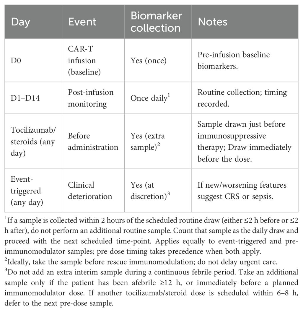 We would consider the potential effects of treatment for presumptive CRS (tocilizumab and/or corticosteroids), which can affect the interpretation after receiving such treatment. Tocilizumab may transiently elevate circulating IL-6 by blocking receptor-mediated clearance, whereas corticosteroids suppress both, but exclusively IL-6 levels through broad immunosuppression (36, 37). A transparent, instructive blood sampling strategy will be adopted to mitigate these confounding factors. Core plan: blood samples will be collected at baseline (Day 0, pre-CAR-T) and once daily from Day 1 to Day 14. In patients receiving tocilizumab or corticosteroids, an additional sample will be collected immediately before drug administration to avoid pharmacologic distortion of cytokine and/or PCT levels, as mentioned in Table 2. In cases of acute clinical deterioration outside scheduled draws, an event-triggered sample may be obtained at the physician’s discretion. The latter can be crucial in instances where fever is not present, despite other signs of CRS/sepsis (38, 39), including haemodynamic instability (hypotension, tachycardia, altered mental status, low urine output (<0.5 mL/kg/hr), cool and clammy skin, and elevated lactate levels).