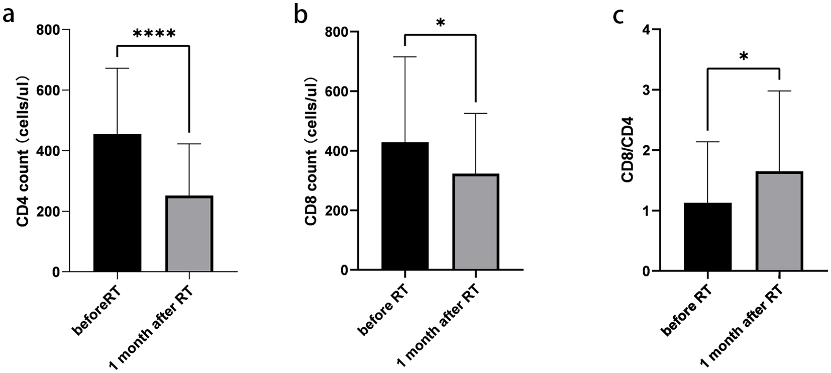 Patient medical records were reviewed to collect demographic and clinical data, including age, gender, smoking history, histological type, lymph node metastasis, clinical stage, and treatment modality (concurrent or sequential chemoradiotherapy). Data on PFS, OS, and ALCs were collected at three time points: before radiotherapy, during radiotherapy (20th fraction), and 1 month after radiotherapy (prior to immunotherapy). Immunological parameters, including CD4+ T-cell counts, CD8+ T-cell counts, and the CD8/CD4 ratio, were also collected before radiotherapy and 1 month post-radiotherapy. Tumor staging was determined according to the eighth edition of the American Joint Committee on Cancer (AJCC) staging system.