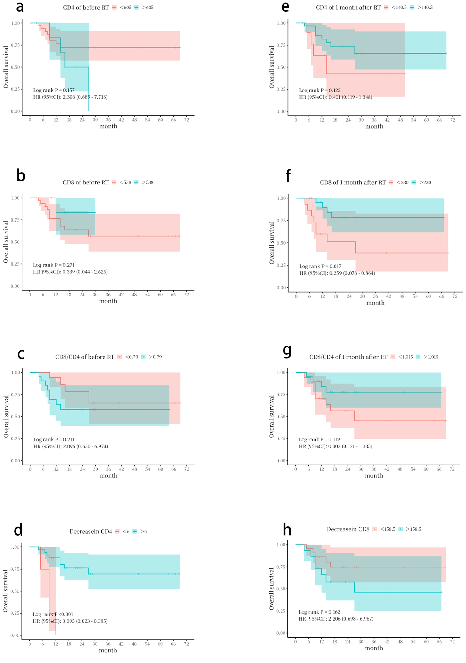 Statistically significant differences were observed in ALCs among the three time points before radiotherapy, at the 20th fraction of radiotherapy, and 1 month after radiotherapy (p < 0.05). Univariate and multivariate analyses identified ALCs at 1 month post-radiotherapy, ALC decrease (defined as the difference between pre-radiotherapy and the 20th fraction of adaptive radiotherapy), and ALC increase (defined as the difference between the 20th fraction and pre-radiotherapy) as independent predictors of OS (p < 0.05). The Kaplan–Meier curves demonstrated that patients with ALCs > 1.015 × 109/L at 1 month after radiotherapy, an ALC decrease > 0.71 × 109/L, or an ALC increase > 0.305 × 109/L had significantly longer OS. Significant differences were also observed in CD4+ and CD8+ counts, as well as the CD8/CD4 ratio, between pre-radiotherapy and 1 month post-radiotherapy (p < 0.05). The Kaplan–Meier analysis further showed that patients with higher CD8+ T-cell counts at 1 month post-radiotherapy had significantly longer OS (p < 0.05).