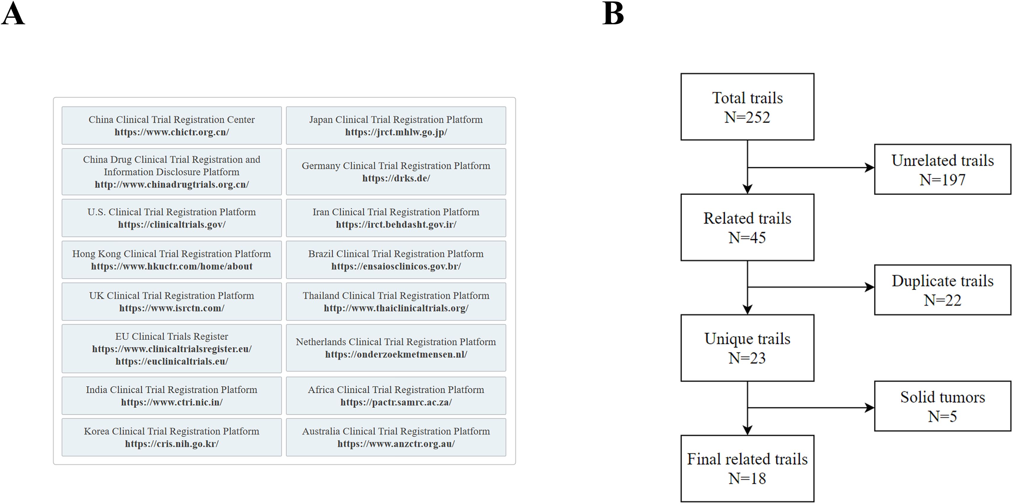 This study aims to systematically evaluate the clinical research landscape of selective RET inhibitors in the treatment of thyroid cancer. We systematically searched 16 global clinical trial registries up to March 21, 2025. Our strategy aimed to cover representative registries across six continents, thereby maximizing retrieval comprehensiveness and minimizing publication bias. The core search encompassed primary registries recognized by the World Health Organization’s International Clinical Trials Registry Platform (WHO ICTRP), such as ClinicalTrials.gov. To increase the coverage of trial information from key regions, we supplemented the search with regional official platforms, including China’s National Medical Products Administration (NMPA) Drug Clinical Trial Registration and Information Disclosure Platform, the Hong Kong Clinical Trials Register, and the African Clinical Trial Registry, among others (Figure 1A). The inclusion of all registries was based on the objective criteria of “public accessibility” and “data availability”.
