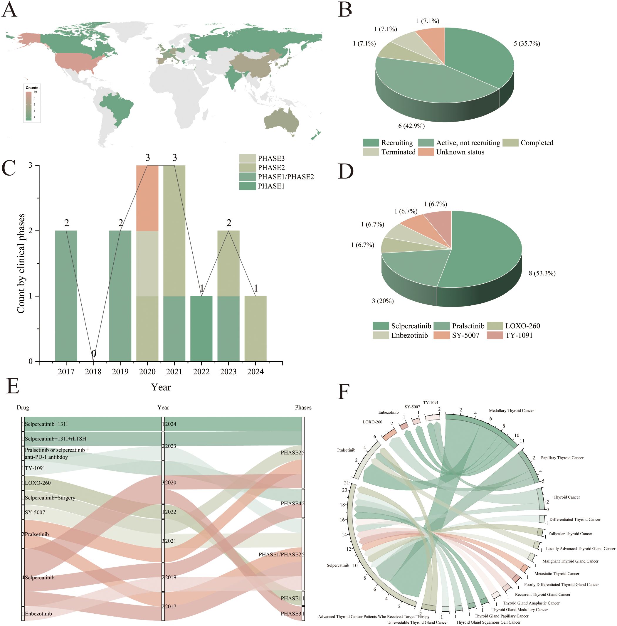 Figure 2. Comprehensive analysis of clinical trials of selective RET inhibitors for thyroid cancer treatment. (A) Distribution of selective RET inhibitors for the treatment of thyroid cancer by country/region; (B) Distribution of the current status of clinical trials in the primary dataset; (C) Registration timeline of selective RET inhibitor trials in the primary dataset, stratified by clinical phase; (D) Distribution of different selective RET inhibitors in the primary dataset; (E) Distribution of clinical trial phases across the different selective RET inhibitors in the primary dataset; (F) Distribution of different selective RET inhibitors for the treatment of thyroid cancer types.