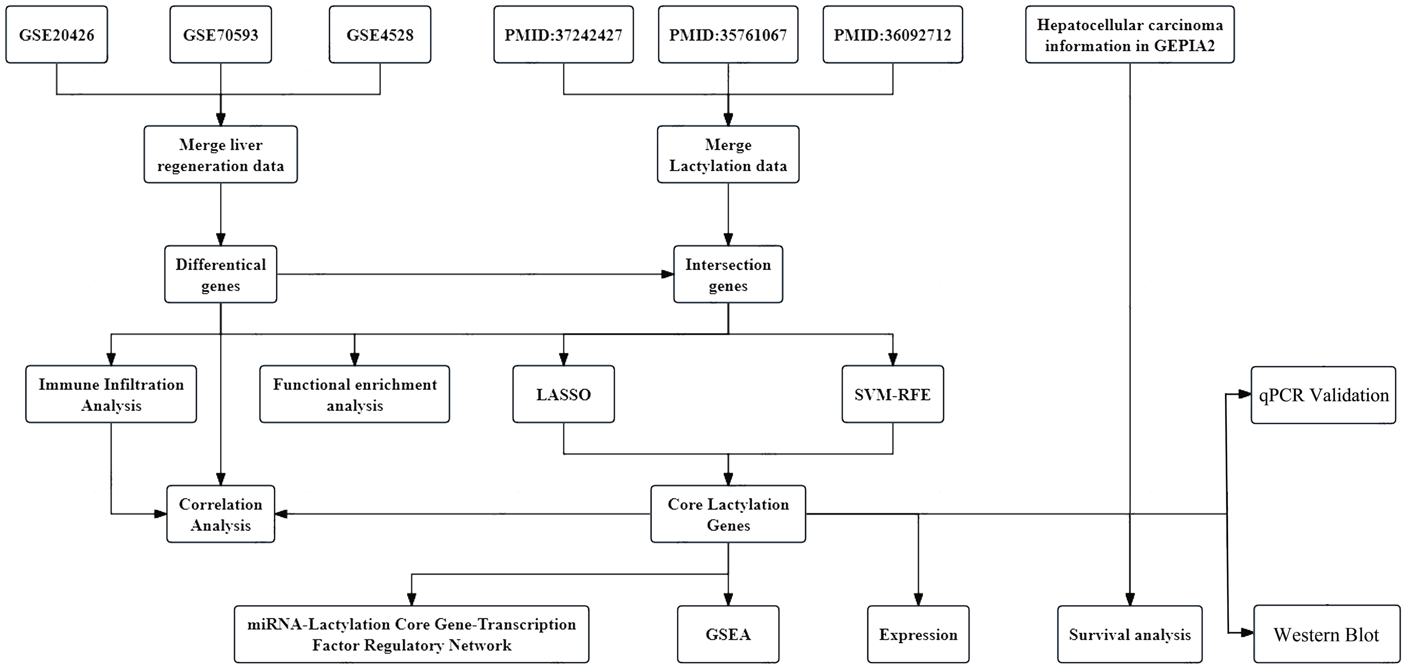 Figure 1. Study flow chart. The study investigates the molecular mechanisms of liver regeneration in mice by collecting and preprocessing gene expression datasets, performing differential gene expression screening and enrichment analysis, and integrating machine learning with immune infiltration analysis to identify and explore core lactylation-related genes. Regulatory network prediction, cancer expression profiling, and statistical validation were conducted to further elucidate their functional roles. Moreover, key findings were experimentally validated through molecular biology techniques, including quantitative PCR (qPCR) and Western blotting (WB).